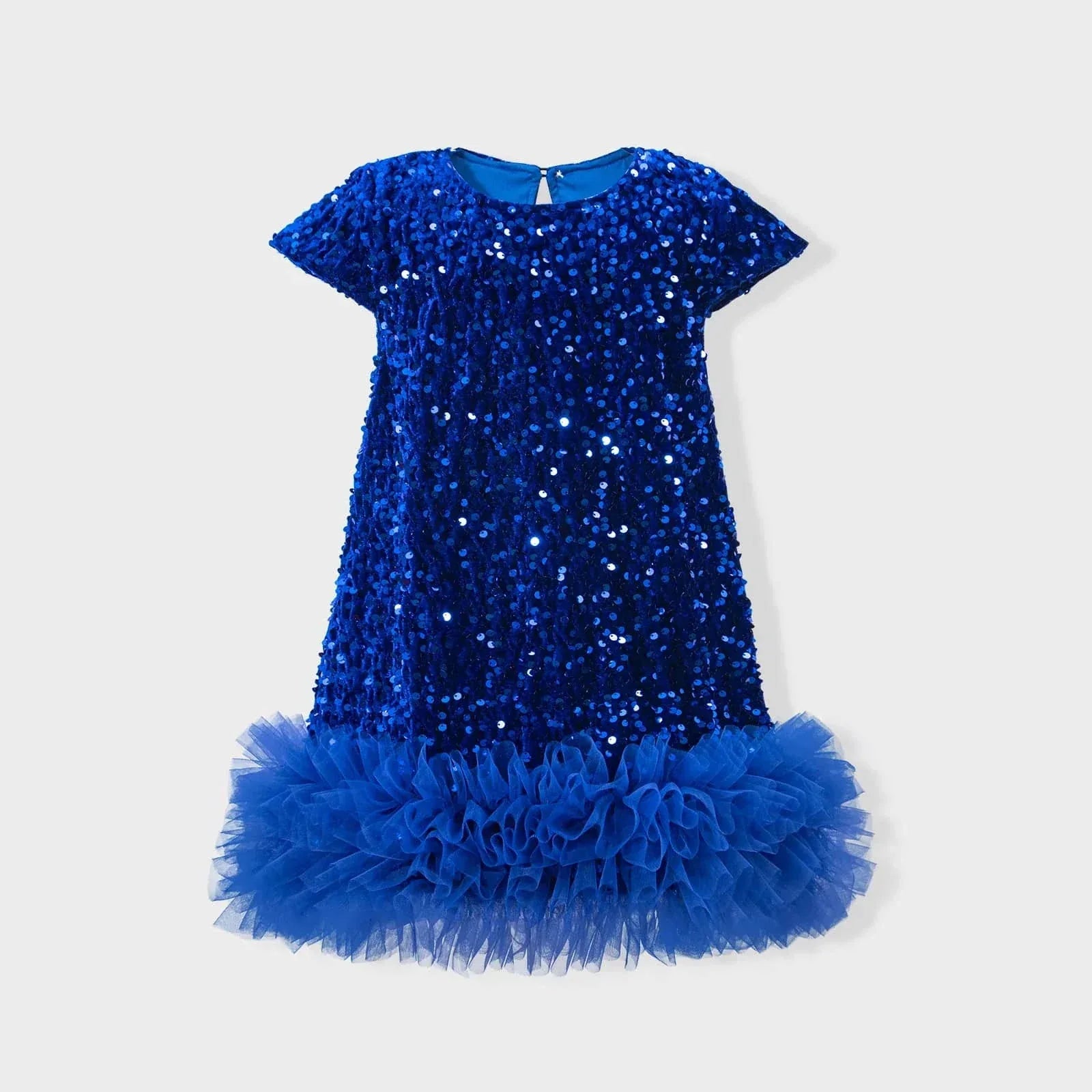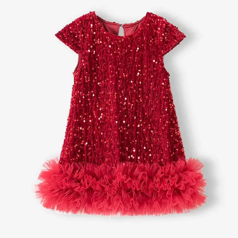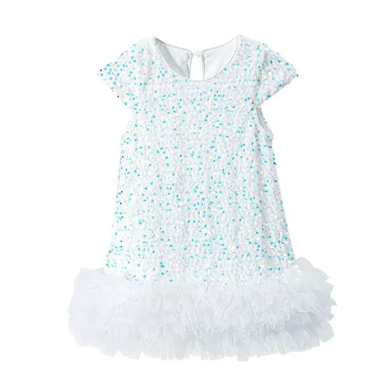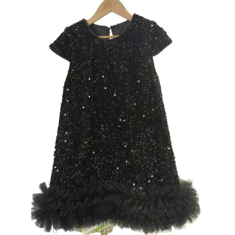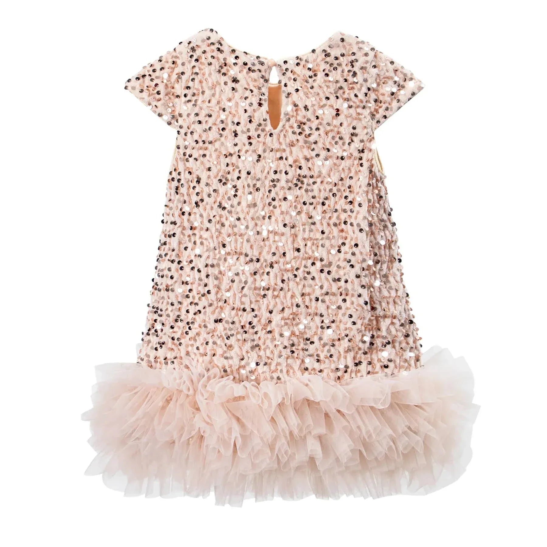 The tulle hemline creates a gentle, fluffy finish. It adds extra volume and charm to the classic design. Each detail of this girls sequined party dress offers comfort for all-day wear. The back buttons make dressing easy. Lightweight fabric ensures your child feels comfortable while dancing or playing.