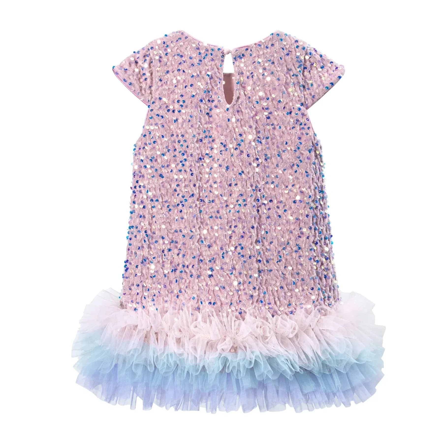 Add a sparkling touch to any special event with The Palm Beach Baby's 'Shimmering Delight' girls sequined party dress. This dress features a soft A-line silhouette. The bodice is covered in dazzling sequins that catch the light with every movement. The fashionable colors give an elegant look, suitable for many occasions. It runs true-to-size
