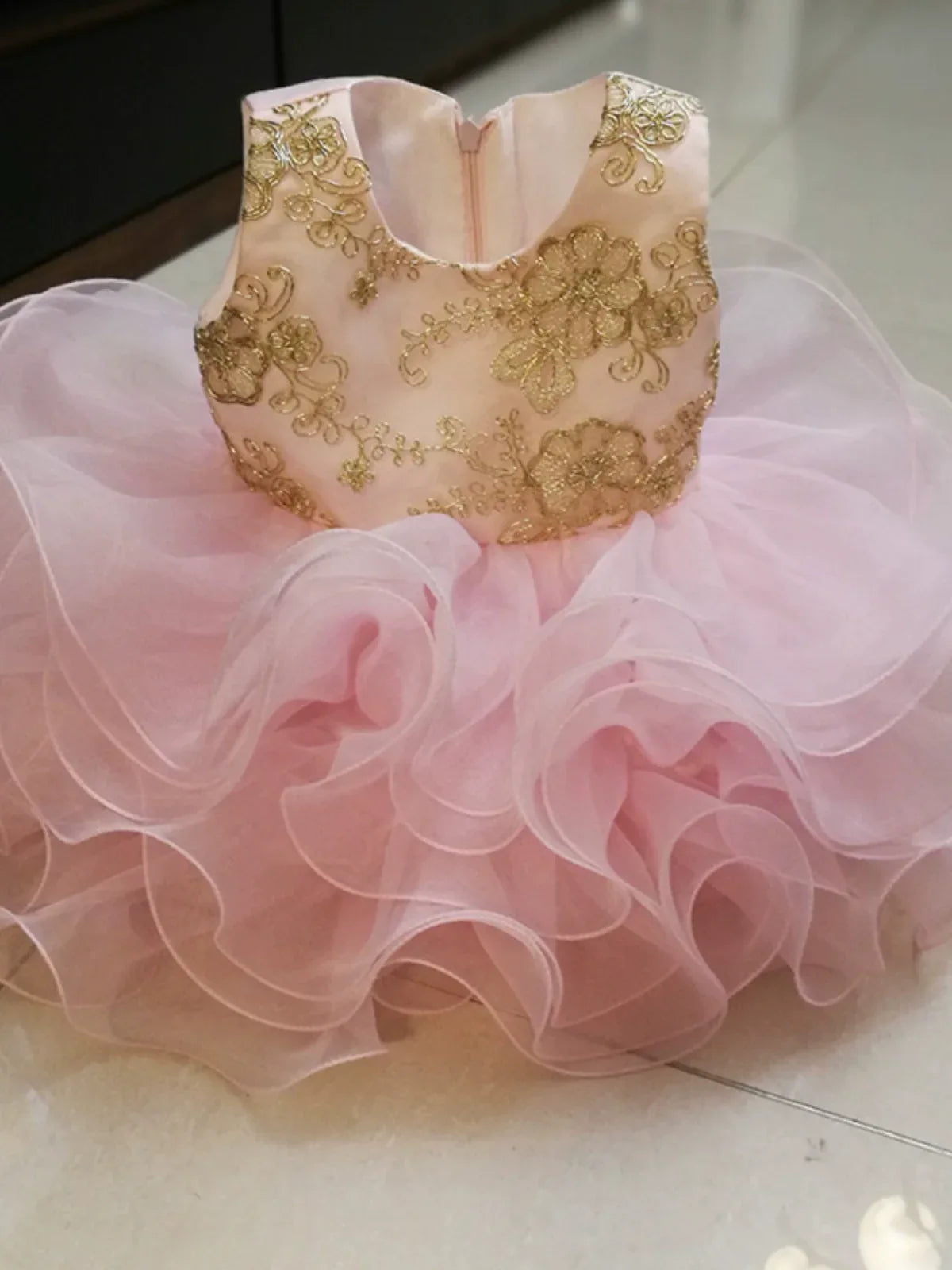 Pink Girls Party Dress with Gold Embroidery, Infant-Toddler