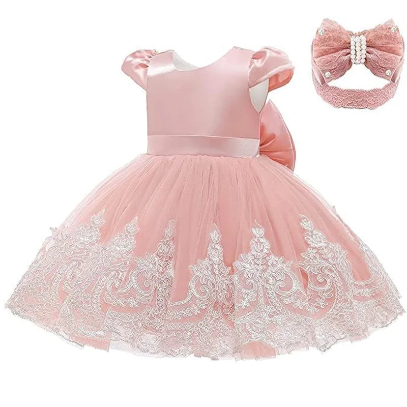 Featuring a stunning round neckline and a sophisticated sleeveless design, this dress is ideal for first birthdays, holiday celebrations, Valentine's Day, and adorning those memorable photo shoots. The highlight of this dress is the lavish, detachable bow that adds a touch of whimsy and charm to the overall look.