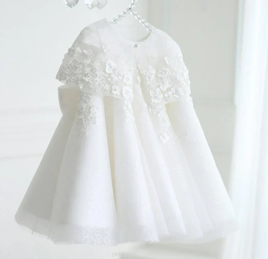 This knee-length dress is available in sizes for girls aged 7 months to 7 years, ensuring a perfect fit for every special event. With lovely cap sleeves, it is perfect for all seasons. The added option of a matching cape drapes across the shoulders, enhancing its elegance while keeping your child warm. The cape is also adorned with delightful flower appliques and faux pearls, making it an ideal companion to the dress.