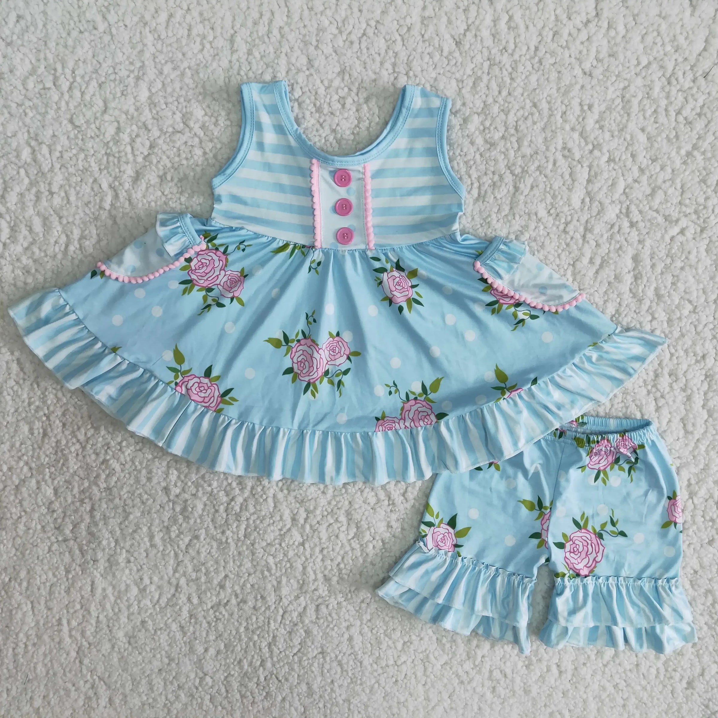 Boho Cutie Girls Shorts Set - Adorable Blue Fleurs