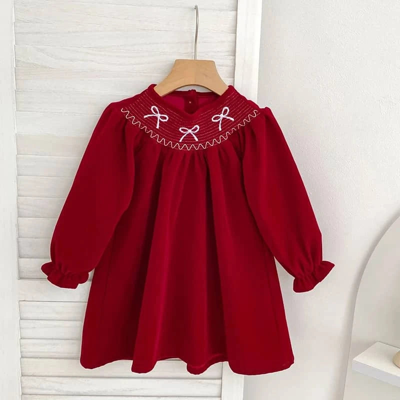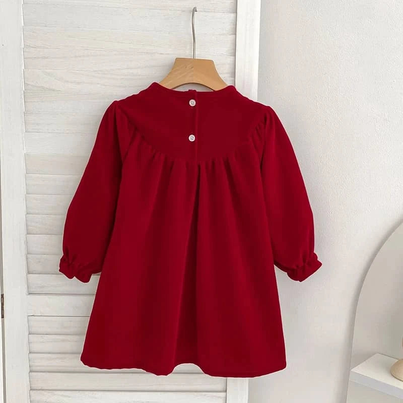 The holiday red smocked dress for baby stands out with its soft material. Gentle on sensitive skin, it ensures comfort for all-day celebrations. The gathered waist gives a classic look, perfect for family photos or holiday gatherings. There is ample room for movement and play.