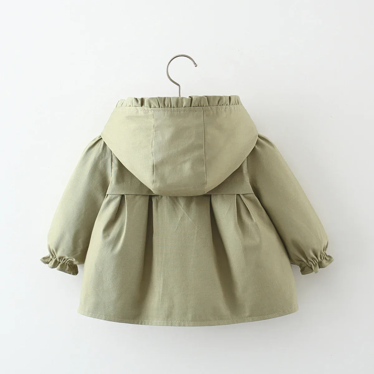 The below images showcase the charming details of the "Maddie" Spring/Fall Hooded Coat: