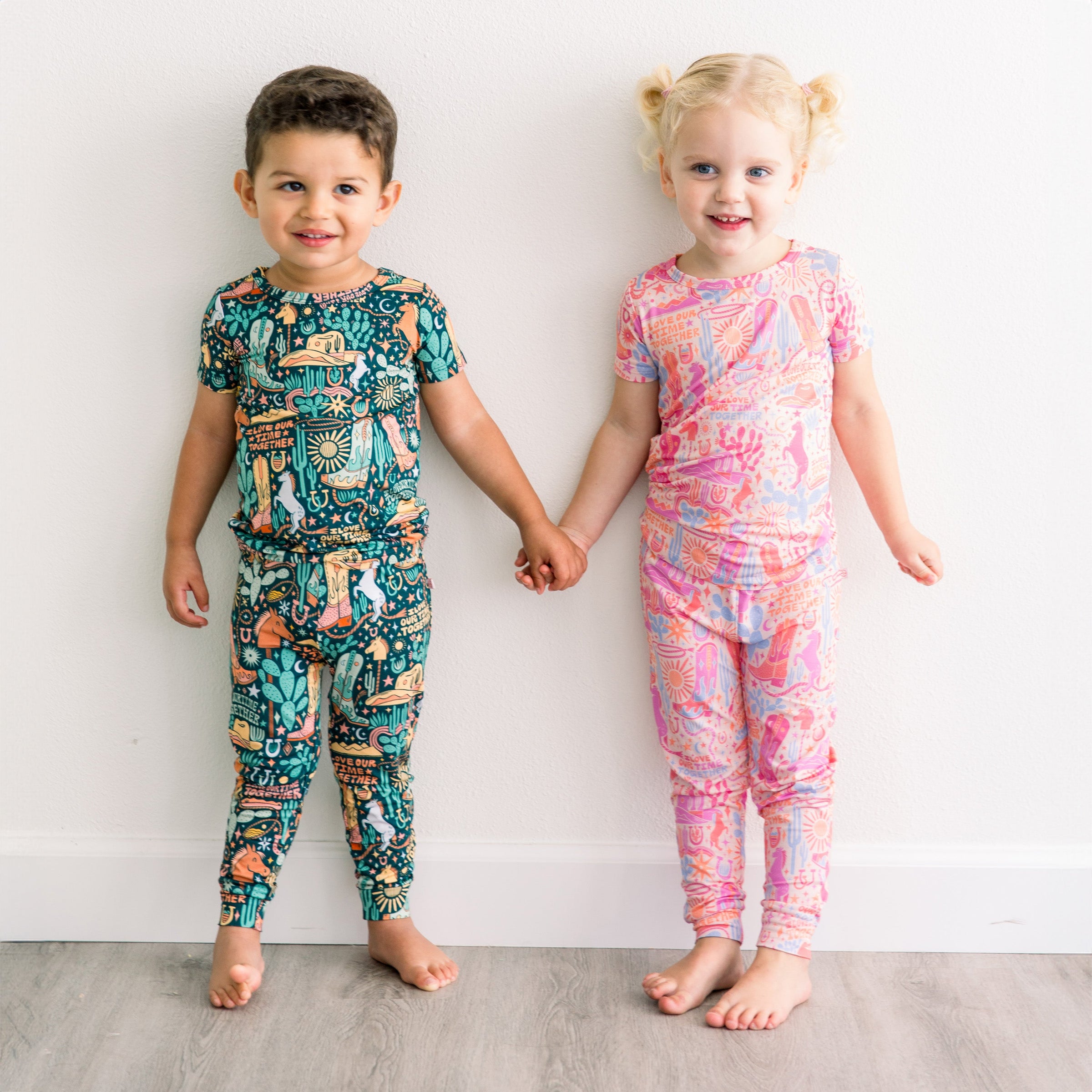This short-sleeve two-piece cowgirl pajama set for girls was designed with parents in mind—because bedtime stories deserve a little magic. Our hand-drawn "Saddle Up" print celebrates the affirmation "I Love Our Time Together," reminding you both of those precious moments before sleep takes over.