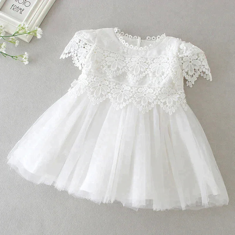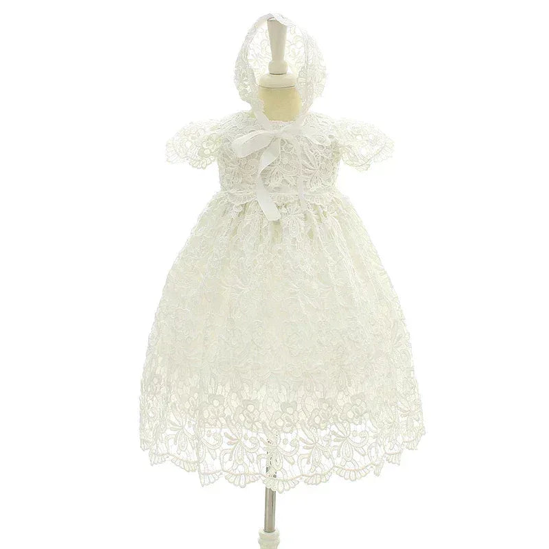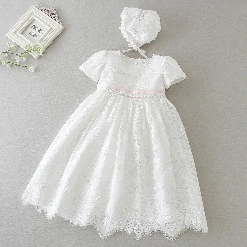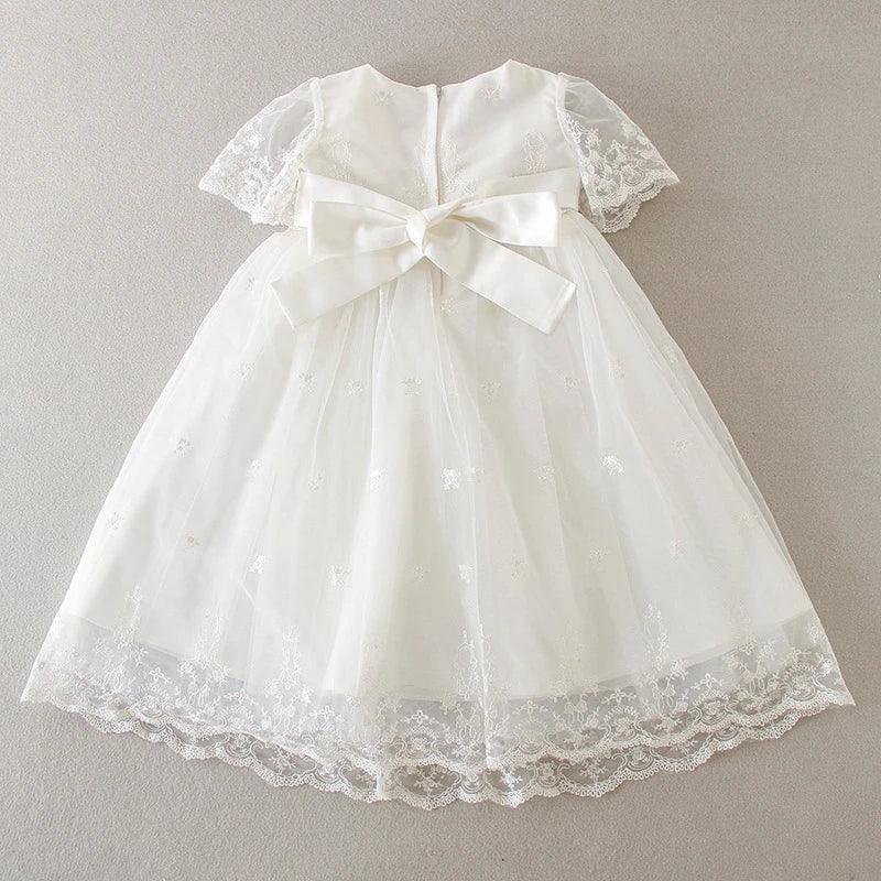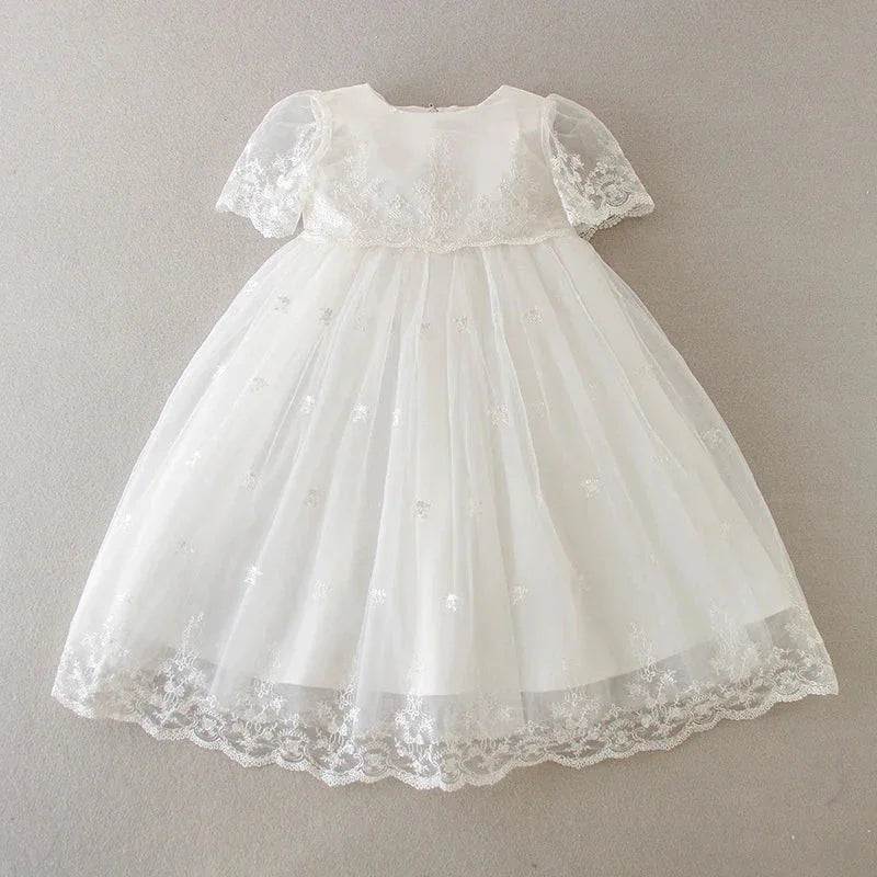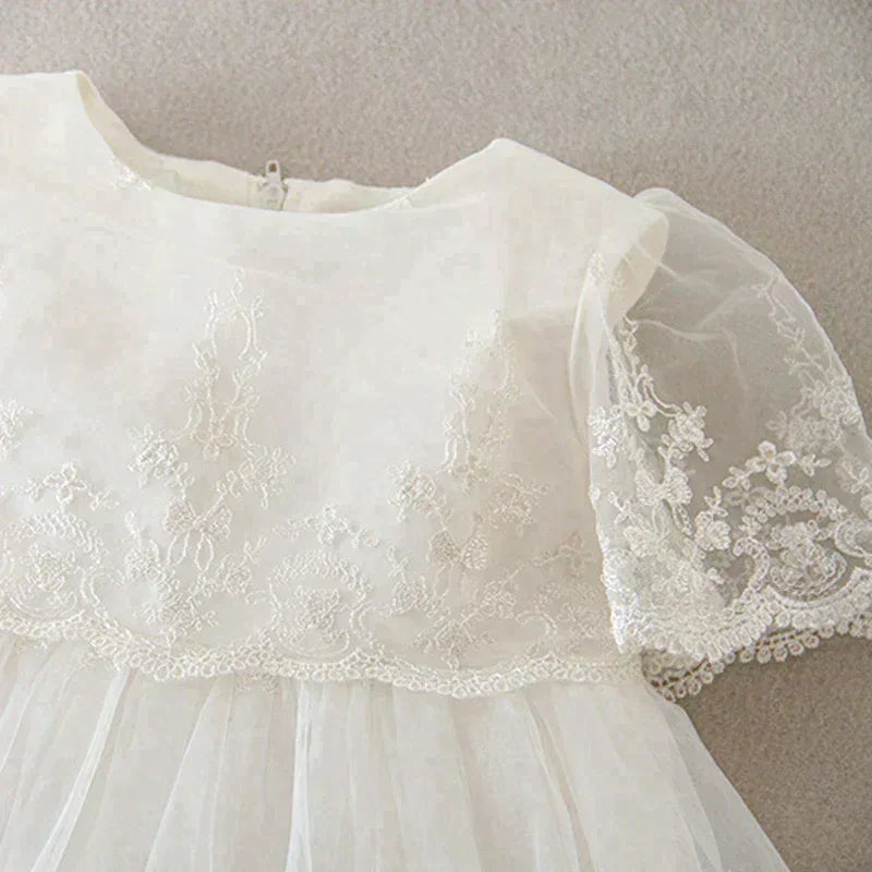 With intricate lace accents adorning the neckline, the "Eva" dress combines timeless design and modern chic. The classic round neckline adds sophistication, making it perfect for baptisms, christenings, weddings, and other special occasions. Your child will shine as the center of attention in this exquisite outfit.