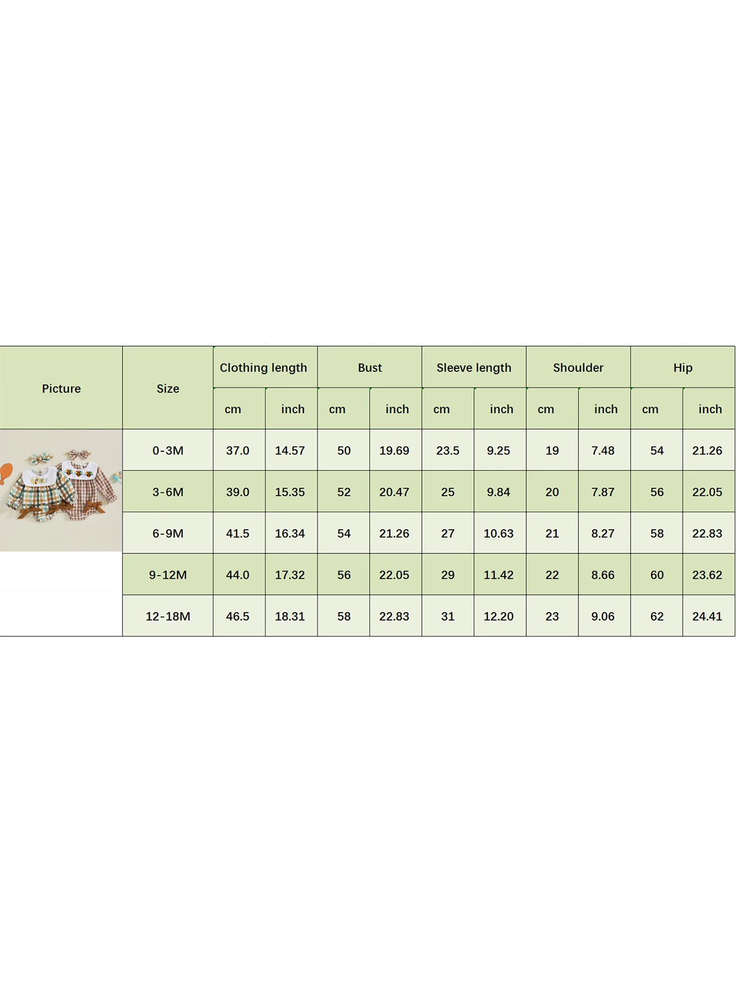 0-3M Length: 14.57 Bust: 19.68 Sleeve: 9.25 Shoulder: 7.48 Hip: 21.26 Advised Age: 0-3 Months