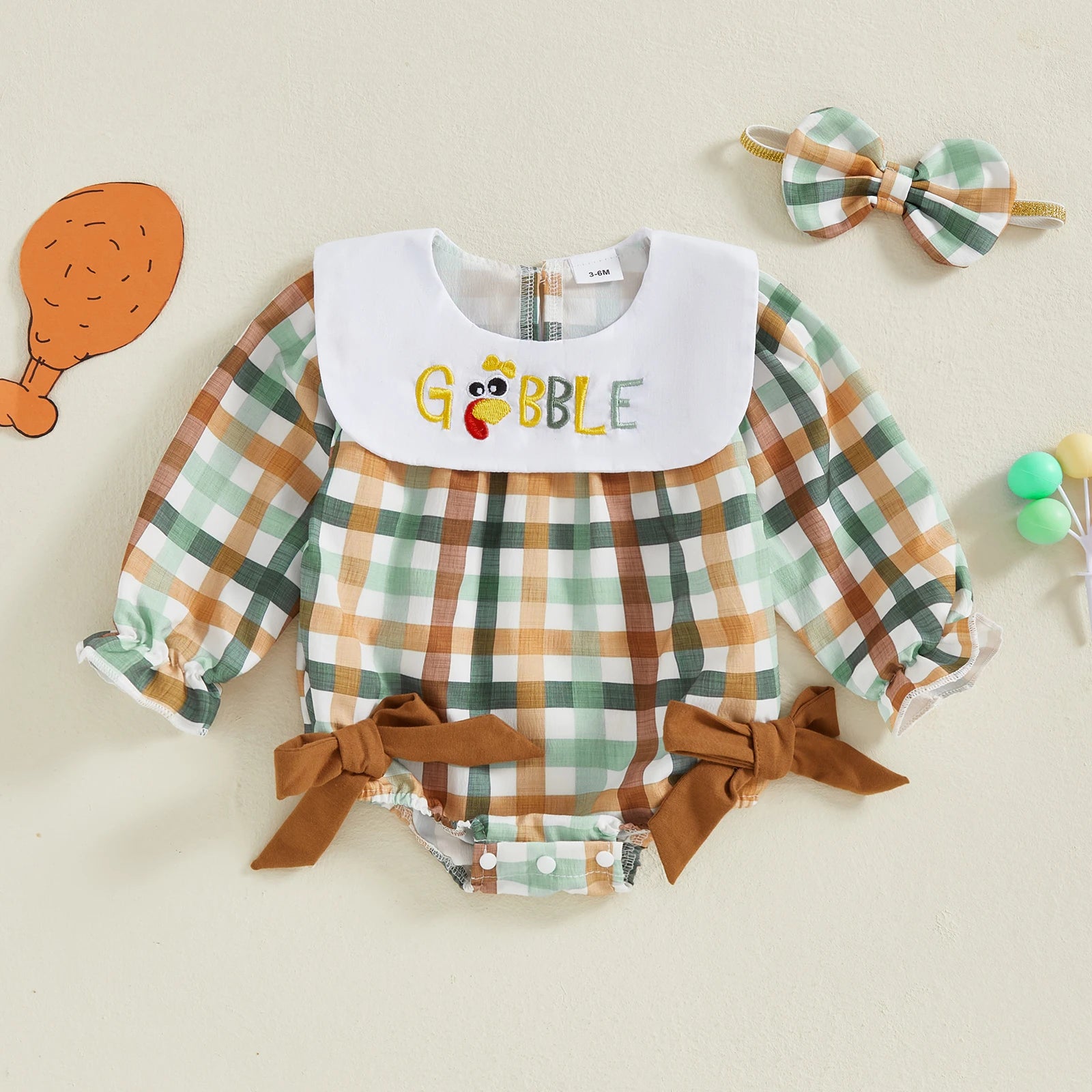 Make your little one the star of the season with the Gobbling Good Thanksgiving Plaid Baby Bubble Set! This delightful 2-piece set, ideal for newborns up to 18 months, is designed with charming embroidered turkeys and playful French bows on bell sleeves that add a whimsical touch to any outfit. The matching head bow ties the look together, making it perfect for festive photos and holiday fun. Crafted from a soft cotton blend, the cozy plaid fabric ensures your baby stays comfy during fall activities, family gatherings, or holiday celebrations like Thanksgiving and Christmas. Thoughtful details such as snapped legs allow for quick and easy diaper changes, while the back fastening keeps the outfit secure and snug. The embroidered bib and round neckline make dressing effortless yet stylish, and the true-to-size fit means your baby can enjoy the perfect look from babyhood to toddlerhood. Be sure to check the size chart for just the right fit to keep your little girl cozy and adorable all season long!