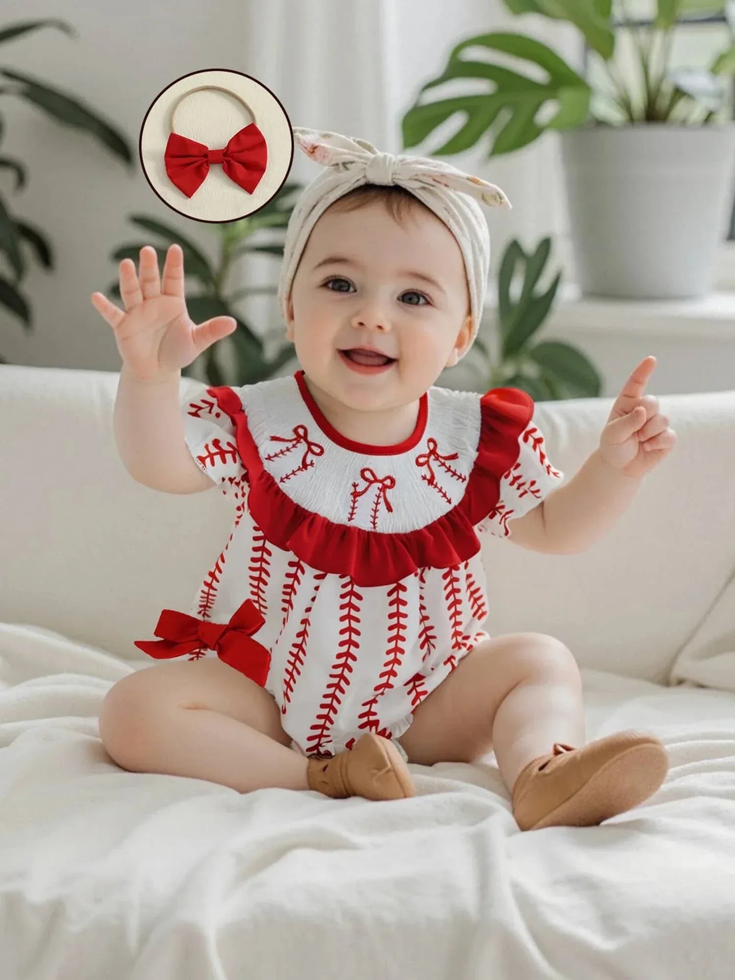Baseball Baby Romper with Red Bow & Ruffle Detail
