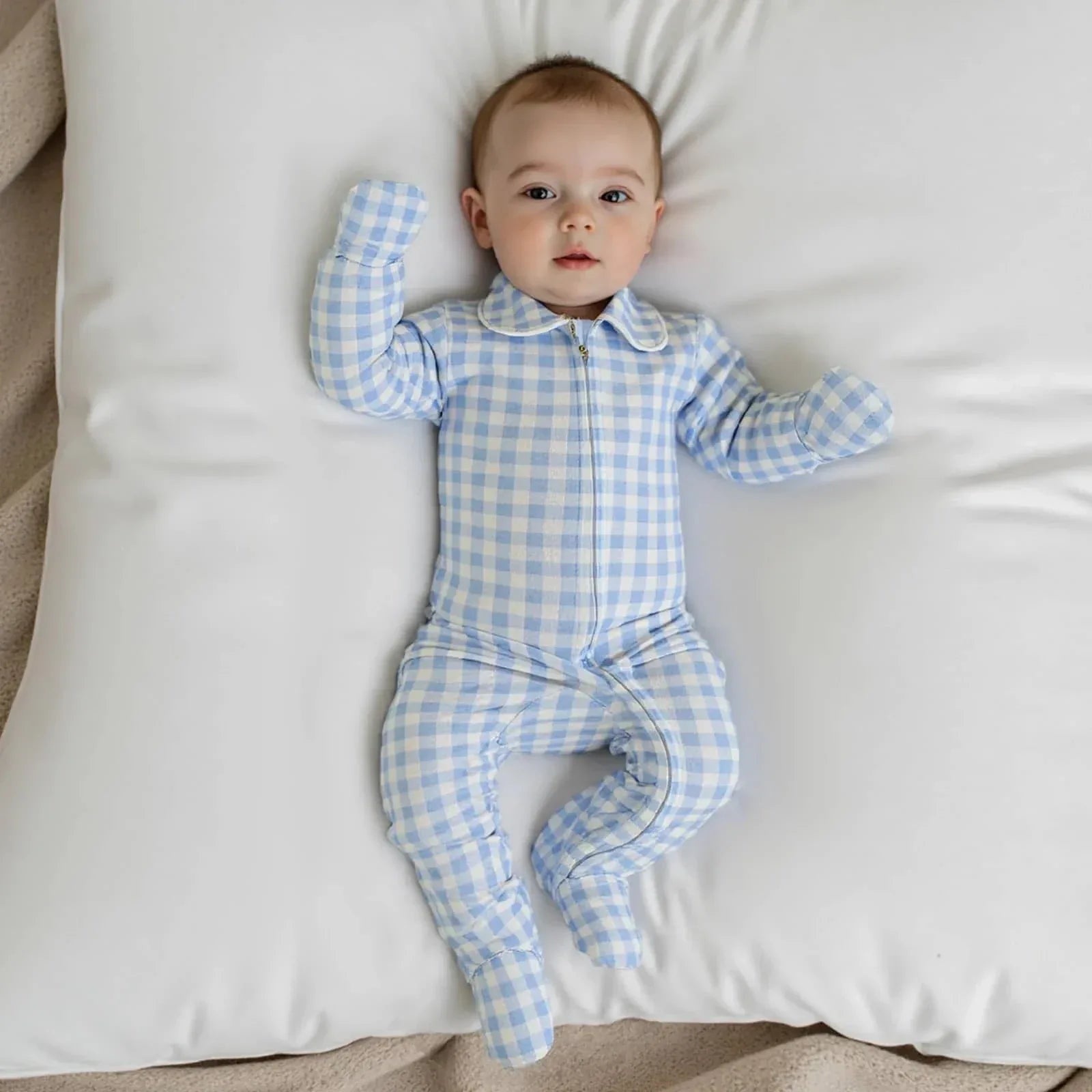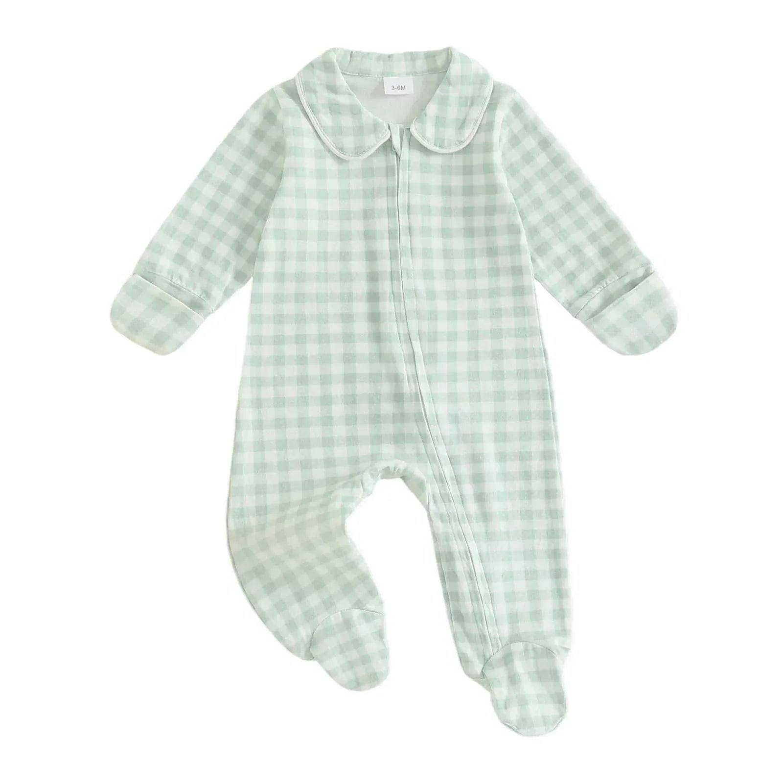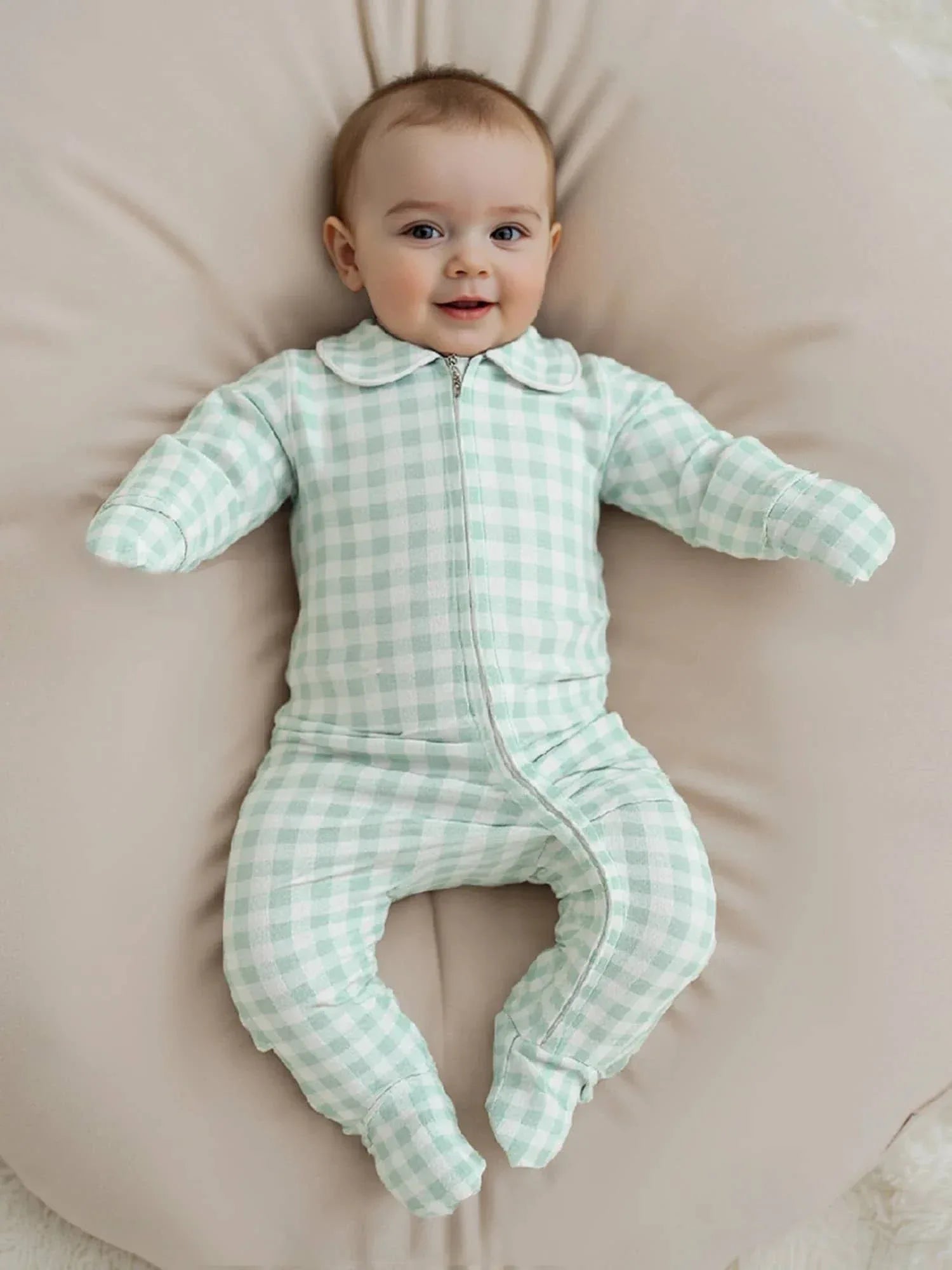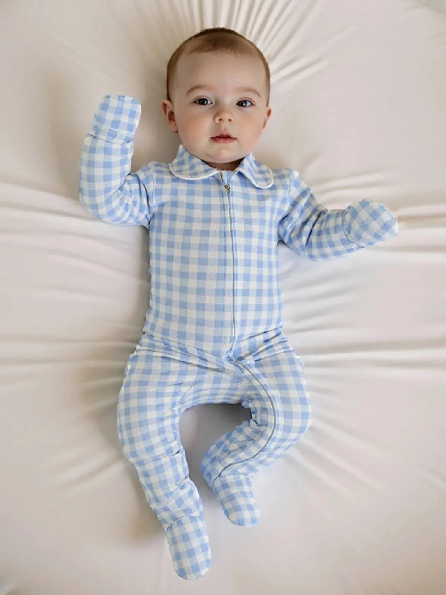 Discover the comfort and style of the checked baby footie with zipper. This adorable footie features a classic Peter Pan collar. The front zipper allows easy changes during any time of day. Babies stay cozy and happy with soft, gentle fabric against their skin.