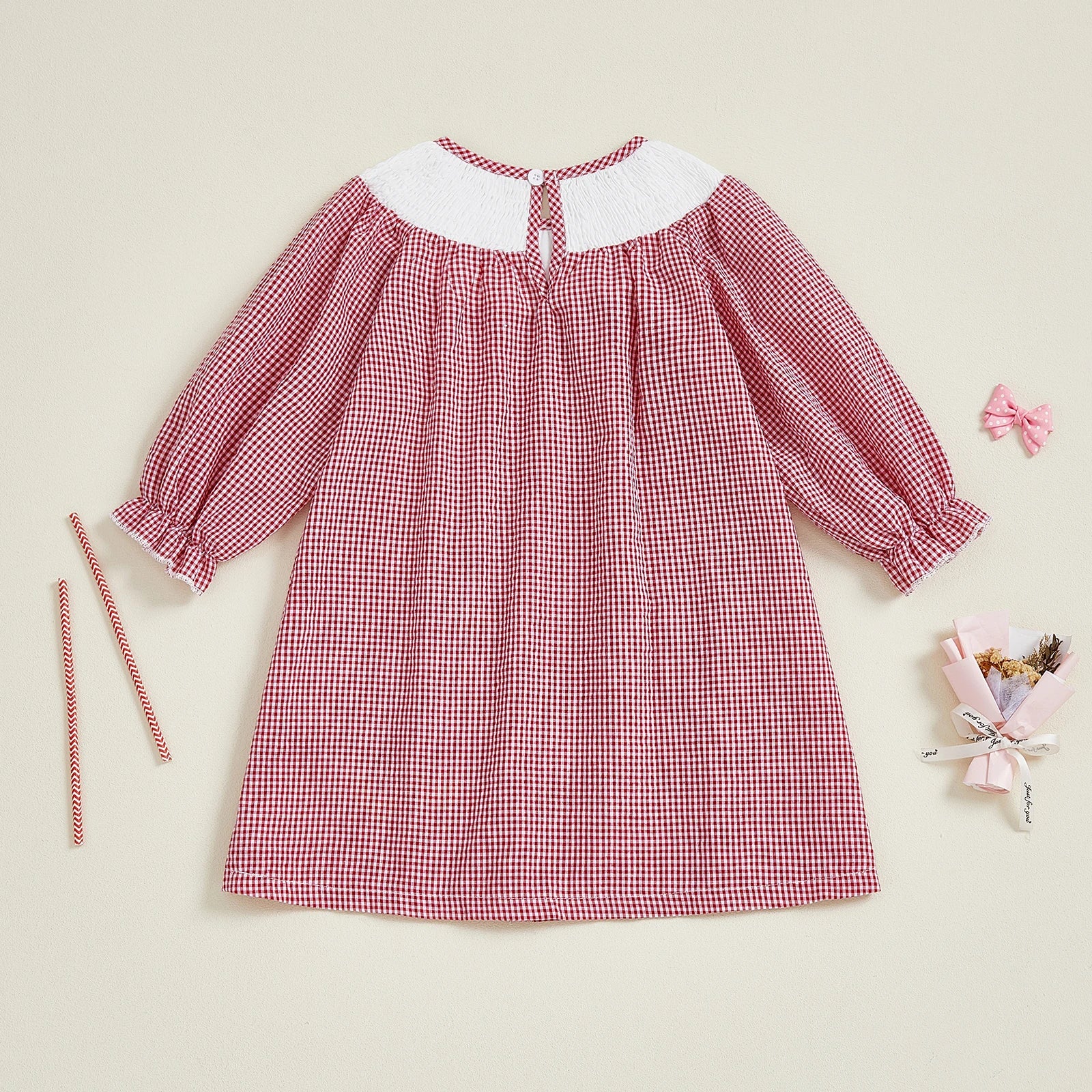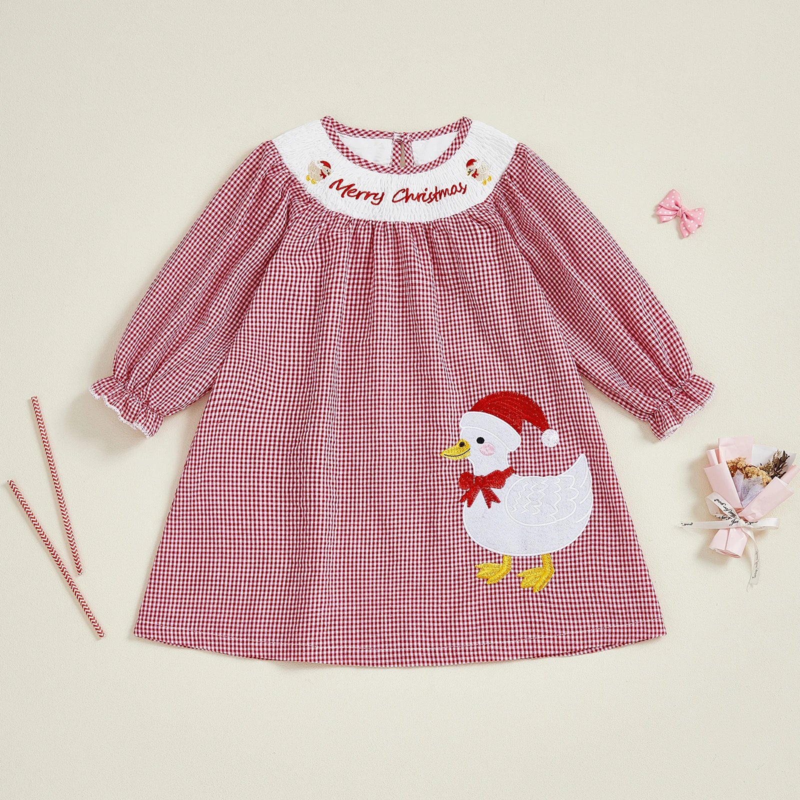 Available in sizes for children from 12 months to 5 years, the Merry Christmas, Ducky! Checked Smocked Dress combines festive flair with practicality. Dress your little one in holiday style, and watch their eyes light up with joy! Make this season unforgettable with a dress that embodies the essence of Christmas joy.