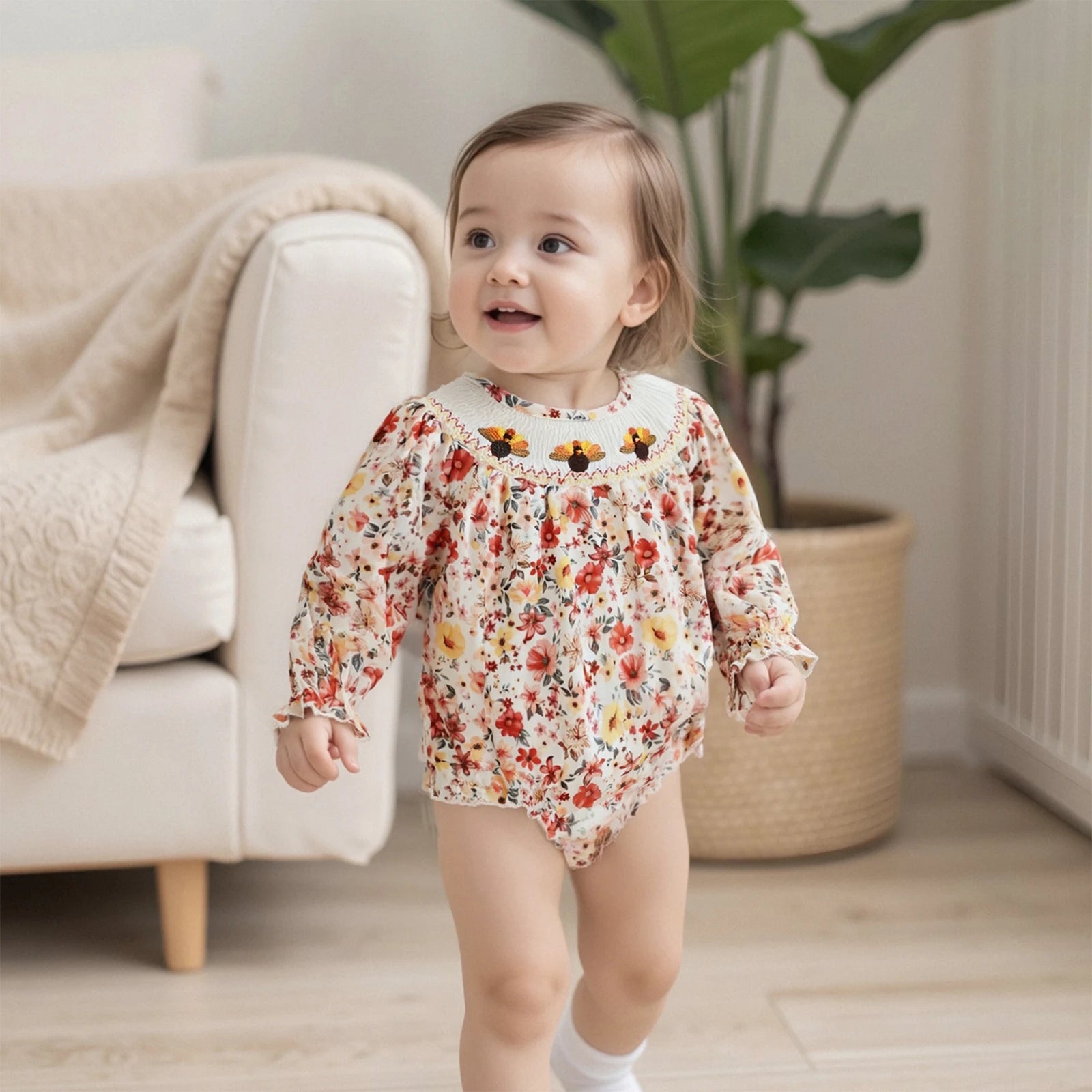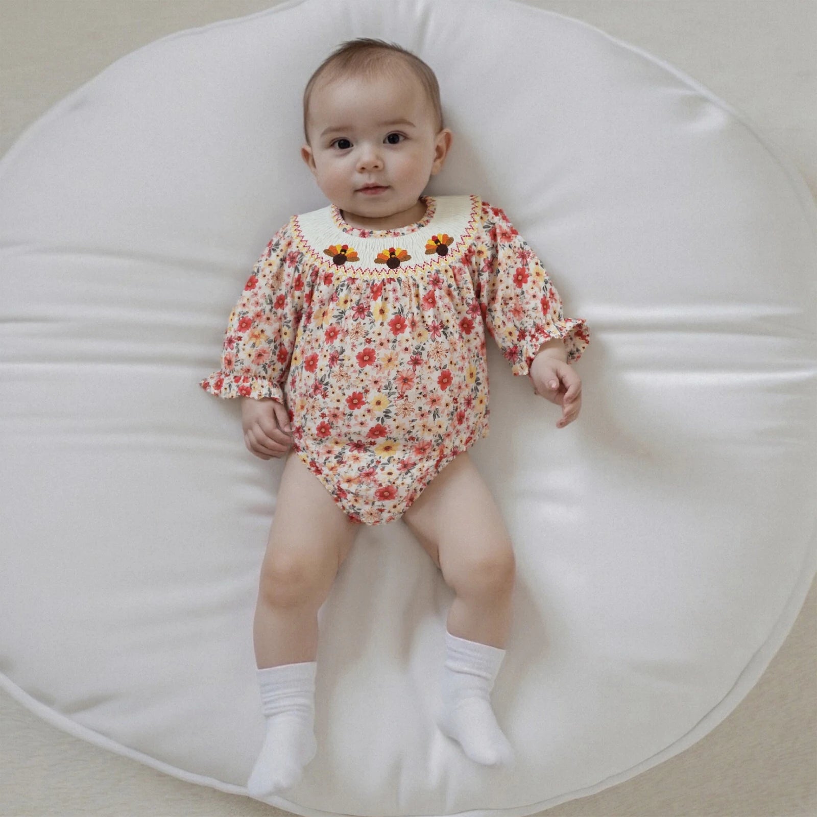 Prepare your little one for the season of festivities with the delightful Three Little Turkeys Smocked Baby Bubble. This enchanting outfit is tailored for newborns up to 18 months and is a must-have for Thanksgiving, Christmas, and autumn celebrations. Featuring a beautifully embroidered turkey surrounded by a charming fall floral design, your baby girl will steal the show wherever she goes!