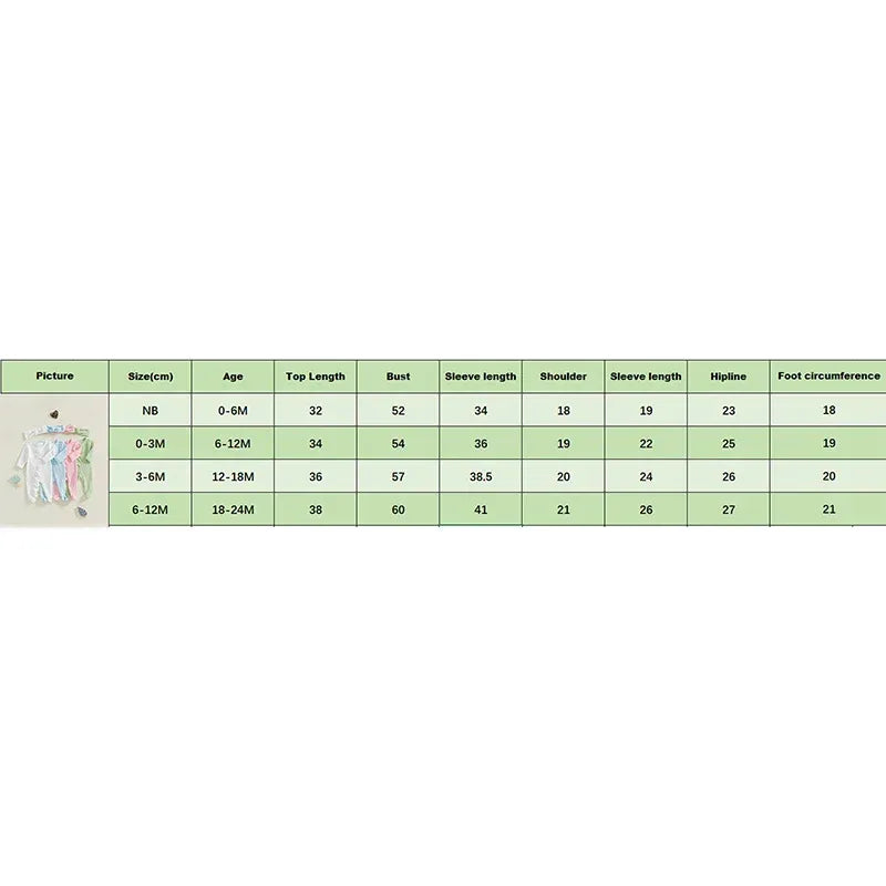 NB Length: 18.11 Bust: 15.75 Sleeve: 7.48 Shoulder: 7.09 Headband Head Circumference: 13.39 Advised Age: Newborn