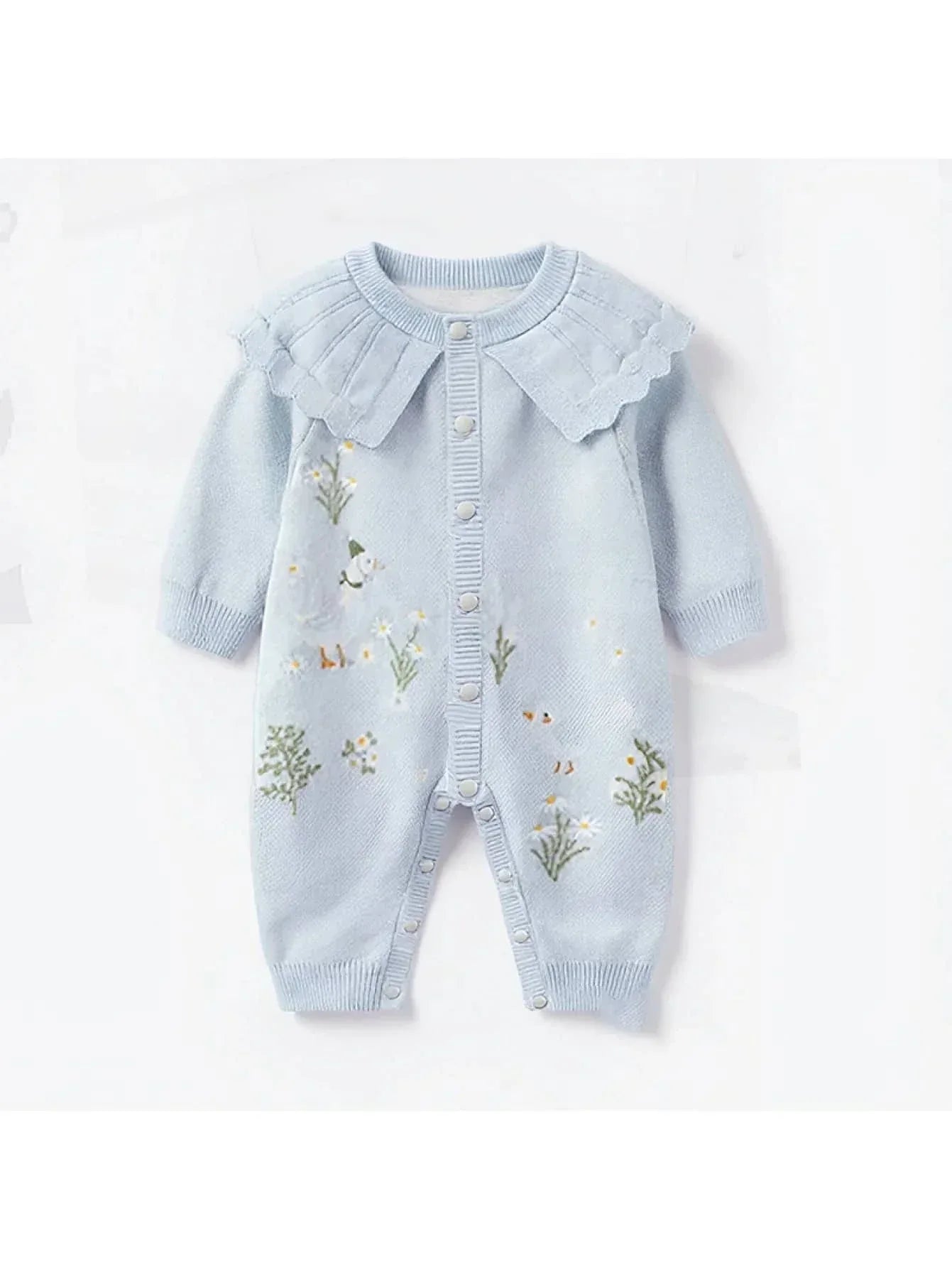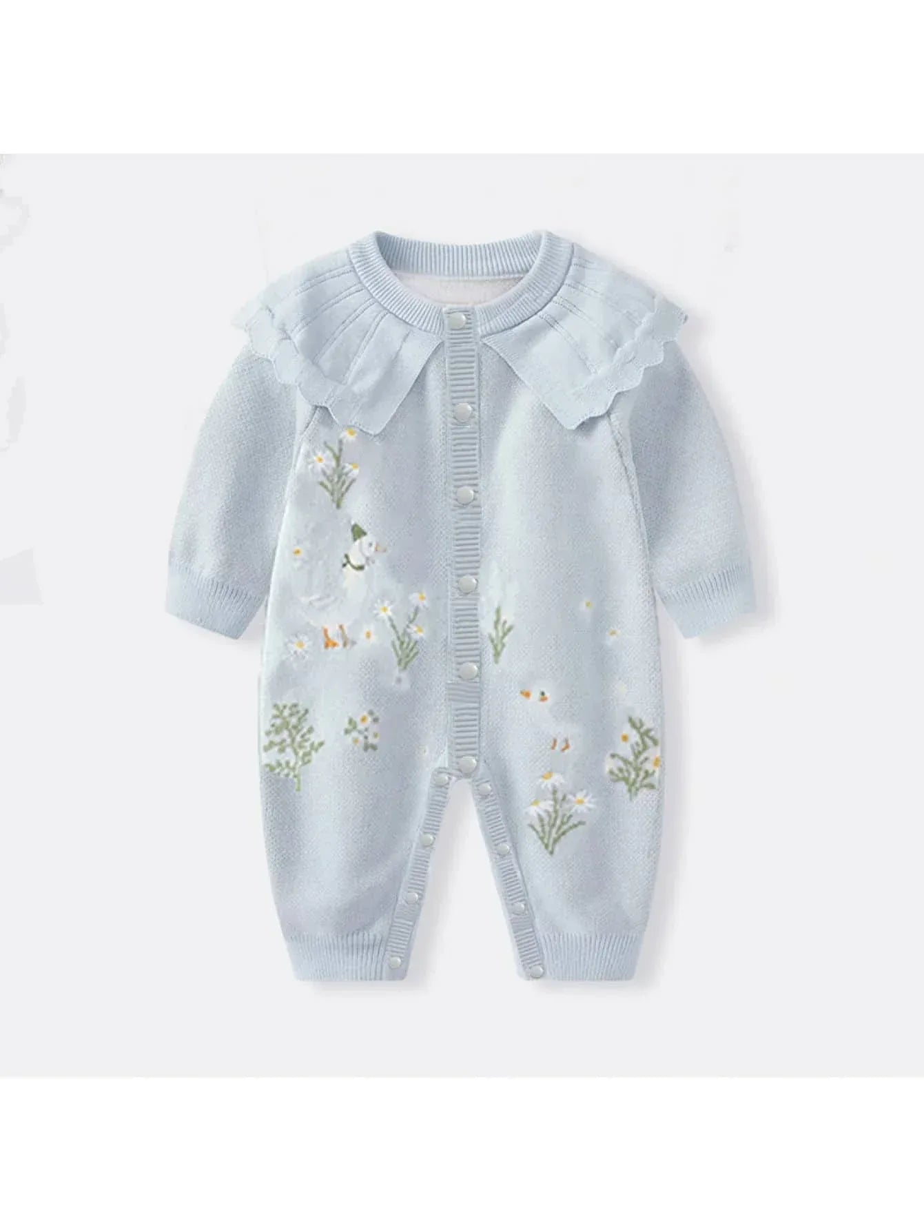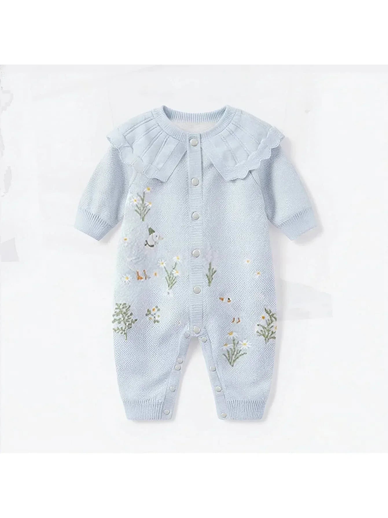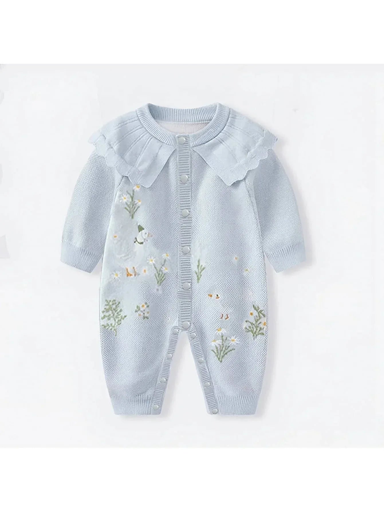 The blue knit baby girl romper suits both casual days and special outings. It weighs lightly so your baby can move freely. The long sleeves offer extra warmth when it is cool.