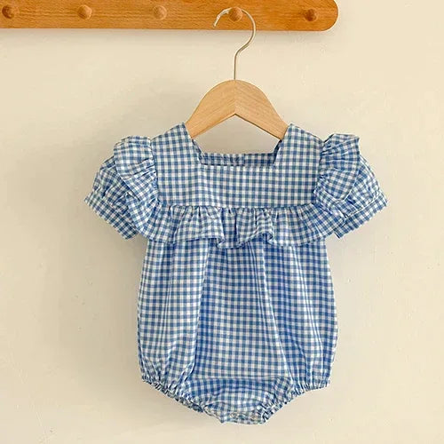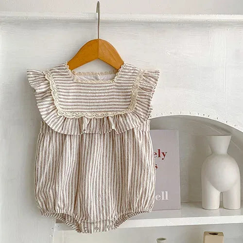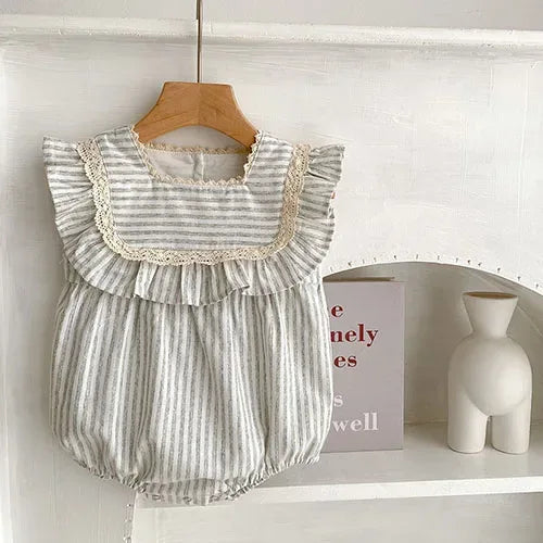 This charming romper features a delightful combination of ruffled accents and a unique button design that adds a touch of whimsy. The snap closure at the bottom allows for quick diaper changes, making it a practical choice for busy parents. You'll love how easy it is to keep your little one looking adorable!