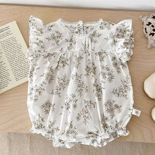 Crafted from a soft and breathable cotton blend, this cute baby bubble-style romper features a snap closure at the bottom for quick diaper changes and buttons at the back for easy dressing. The gathered skirt allows for plenty of movement, making it ideal for crawling or walking. The charming beige and cream floral design adds a touch of sweetness, whether your baby is at a family gathering or enjoying a summer day out.