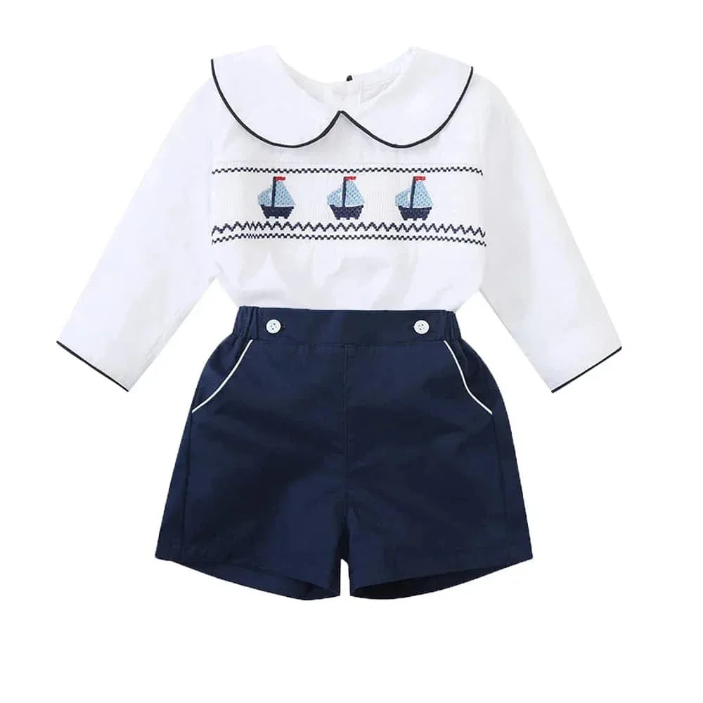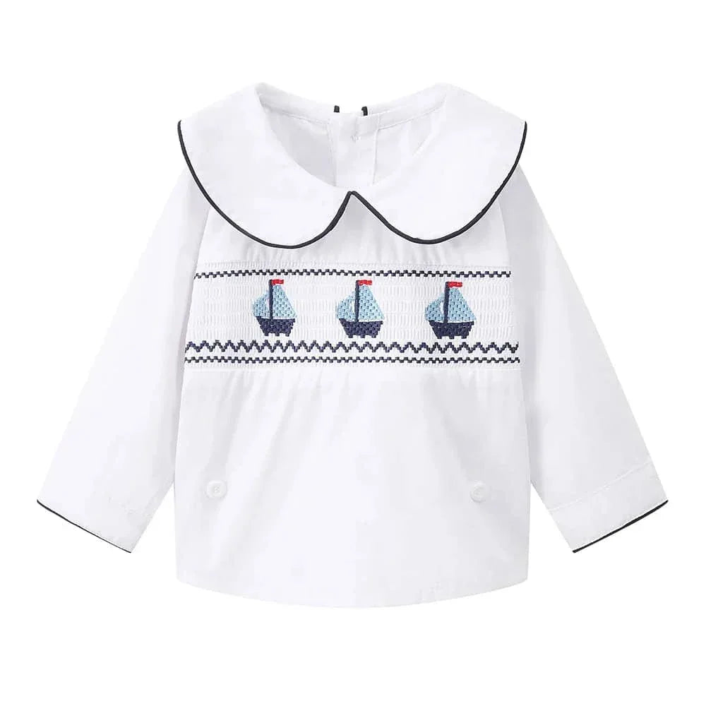 This nautical smocked romper for baby boys features timeless smocking detail. Sweet sailboat embroidery adds playful charm. The crisp collar frames your baby's face. Snap closures at the bottom make changes simple and quick.