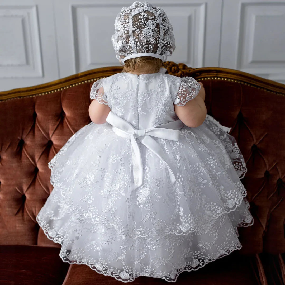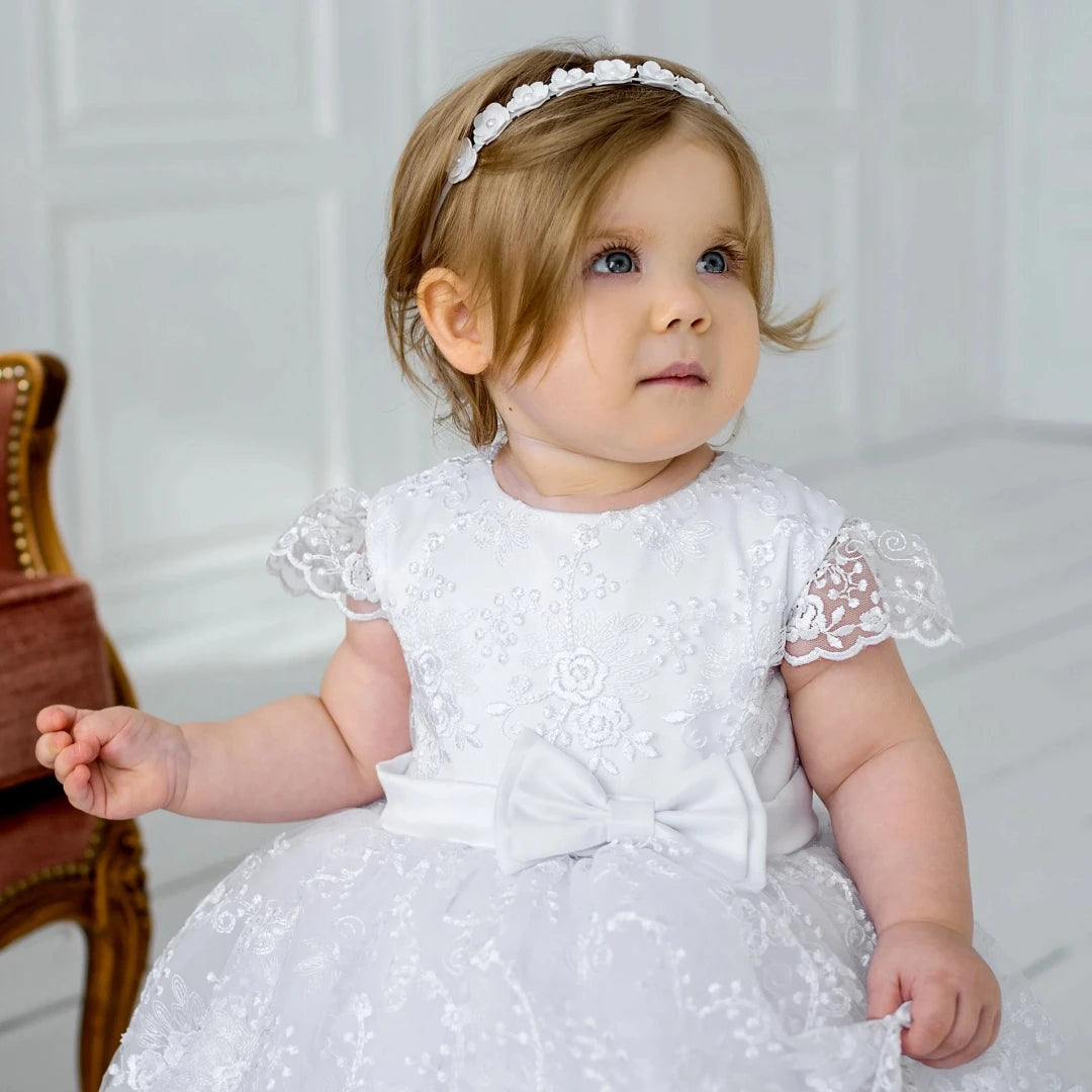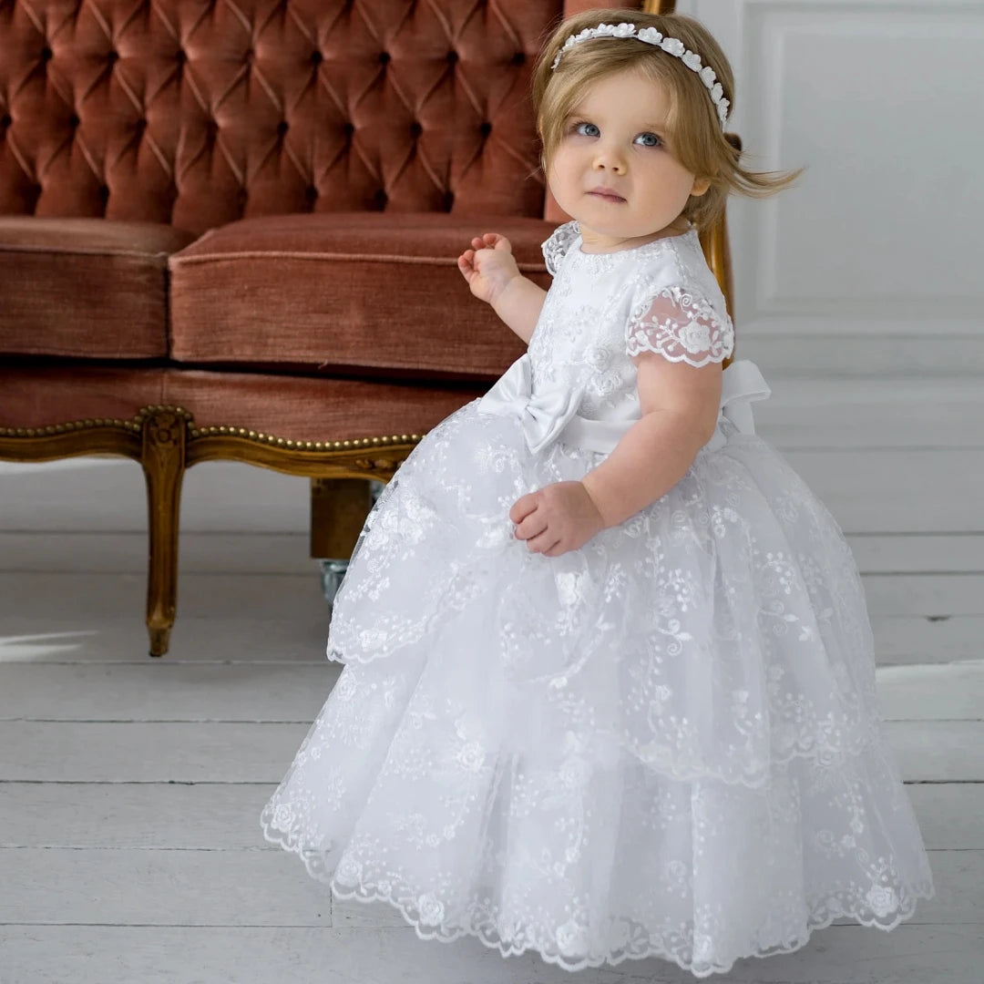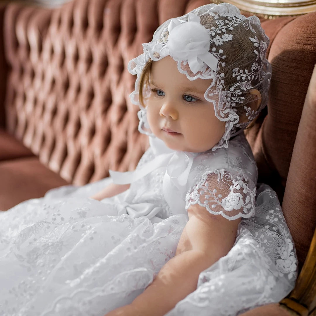 The "Baby Nora" Long Delicate Lace Baptism Gown represents the pinnacle of infant formal wear, meticulously crafted for parents seeking an authentic, sophisticated option for their child's most significant celebrations. This floor-length masterpiece combines premium polyester with delicate tulle construction, creating a garment that balances visual elegance with practical wearability for active infants and toddlers. Distinctive design elements include ornate lace appliqués, a charming bow accent, and an all-over floral lace pattern that creates depth and visual interest. The classic round neckline frames the face beautifully, while short sleeves (available in 4-16 inch lengths) provide appropriate coverage for various seasons and venues.