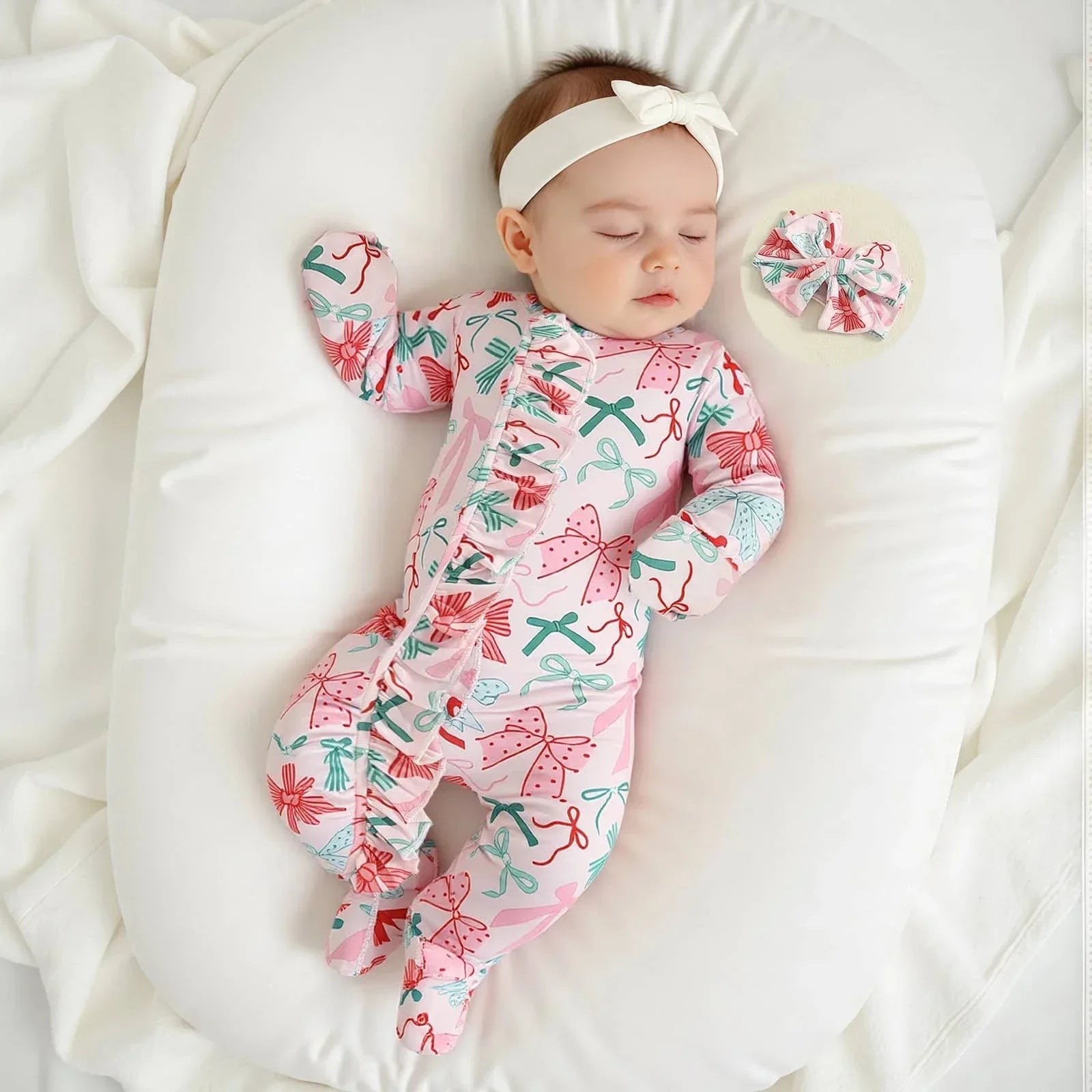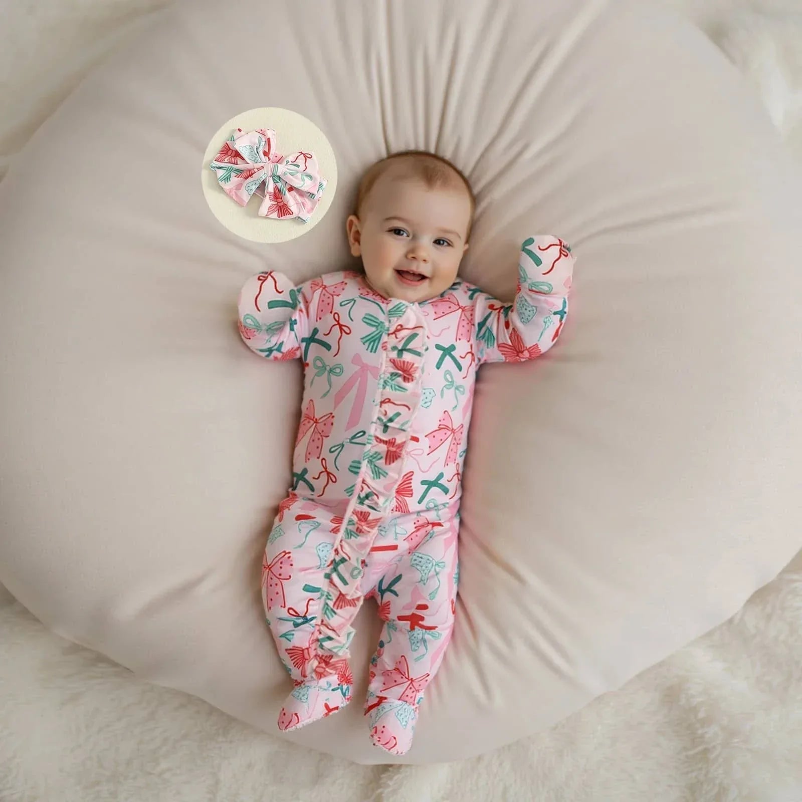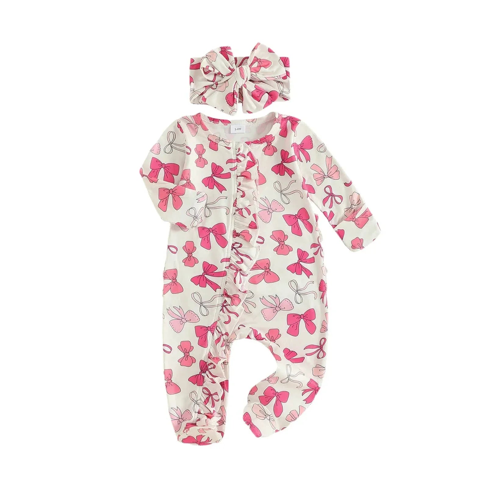 The baby girl footie romper set wraps your baby in gentle fabric designed for all-day wear. Snap closures make changes quick and easy. Your baby stays warm with full foot coverage. Delicate bows add a sweet, playful charm that suits every occasion.