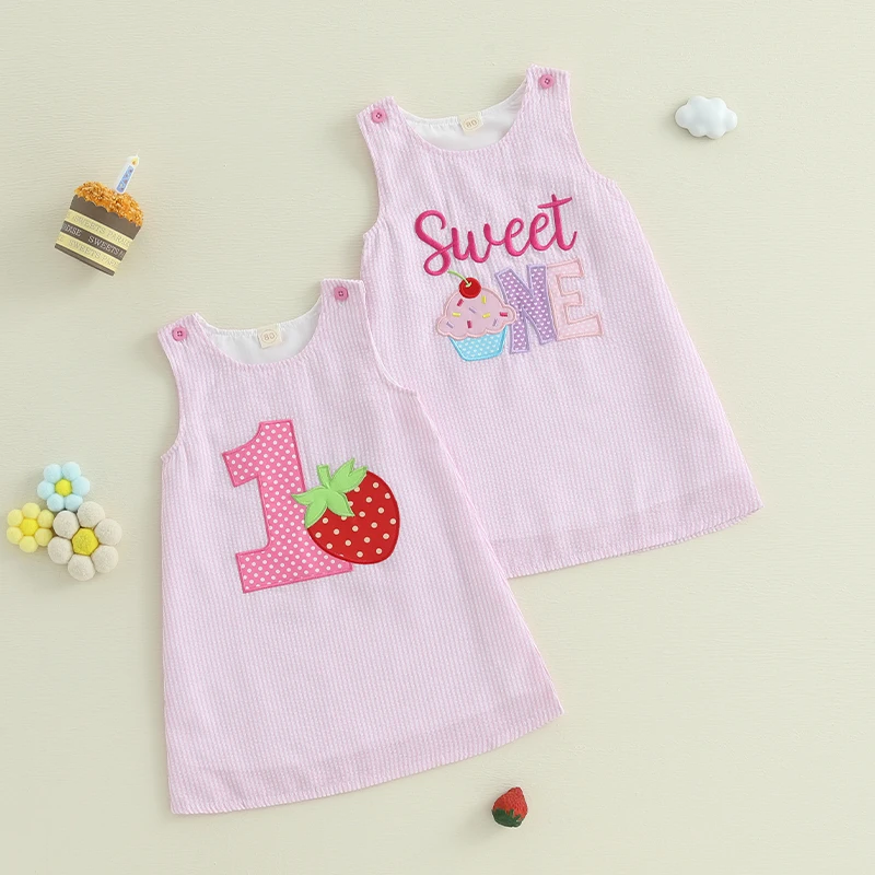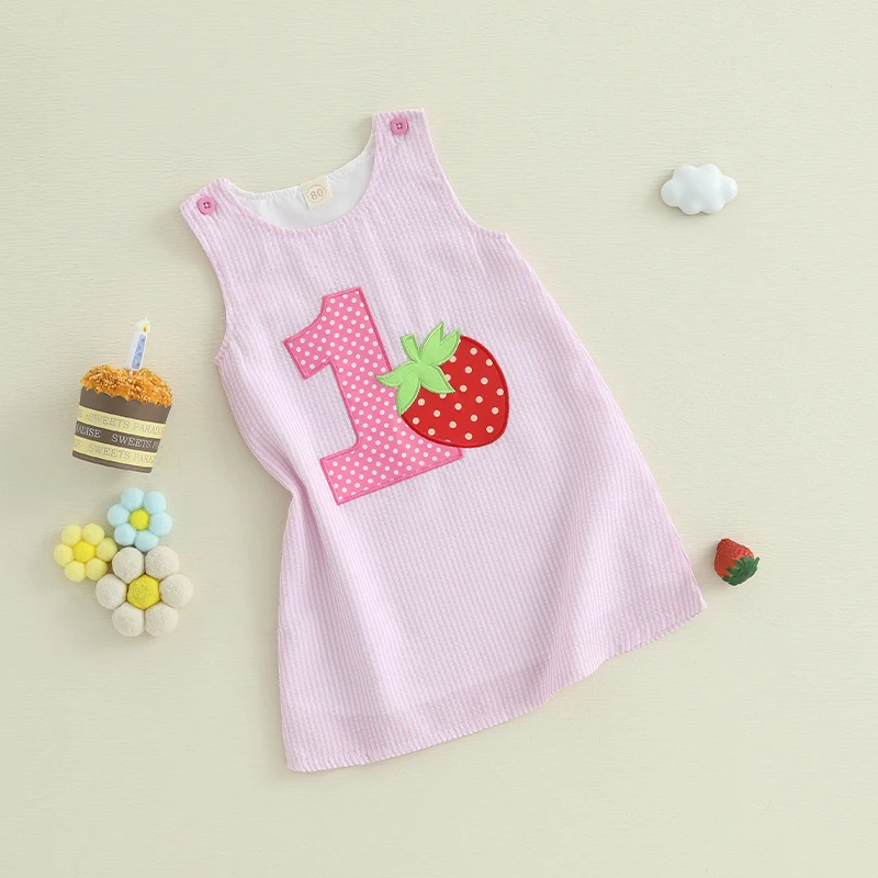 Make your little girl's first birthday truly special with our enchanting "Strawberry Girl's First Birthday" A-Line Dress. This delightful dress is designed to combine fun with elegance, featuring two unique styles: a charming seersucker fabric and lively birthday-themed appliques. Your child will shine brightly during every celebration!