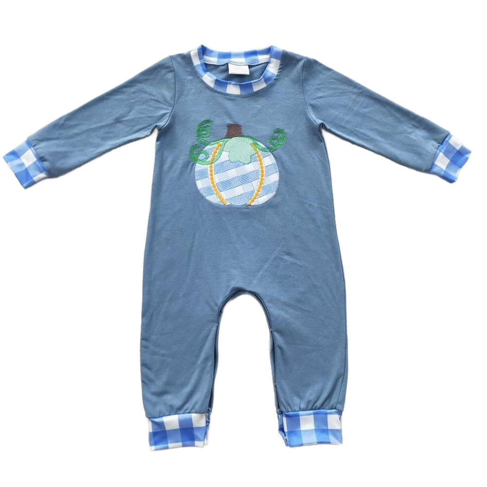 Crafted from a soft and durable cotton blend, our romper offers both comfort and style. The charming blue plaid pumpkin design complements the playful plaid trim, making it an ideal choice for family gatherings, playdates, or just cozy days at home.
