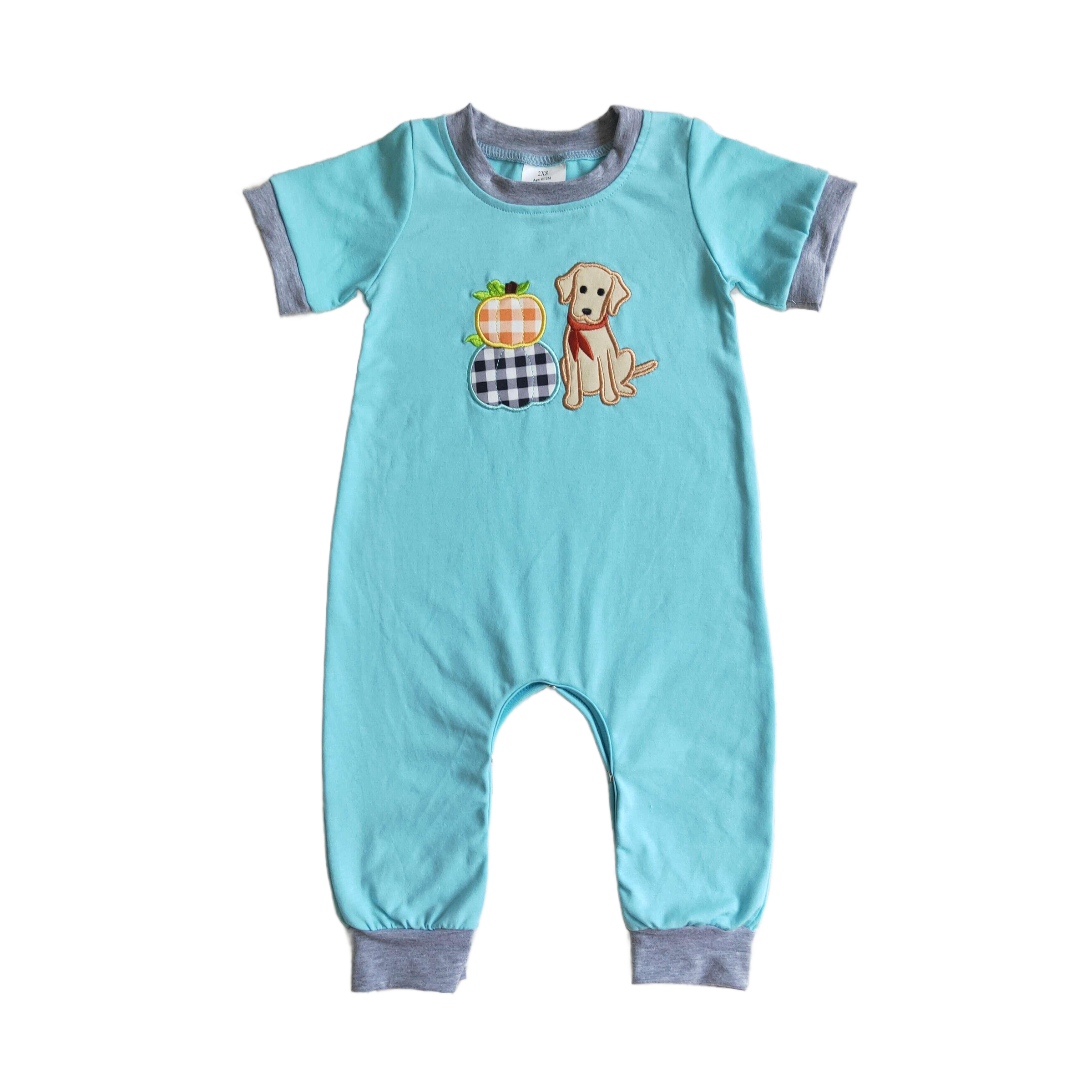 The romper features a delightful checkered pup design paired with two cute printed pumpkins, ideal for celebrating those autumn festivities. Whether you're going for a stroll in the park or hosting a family gathering, this romper is versatile enough to wear from Autumn through Summer. The classic aqua blue color with grey trim makes it easy to match with various outerwear pieces.