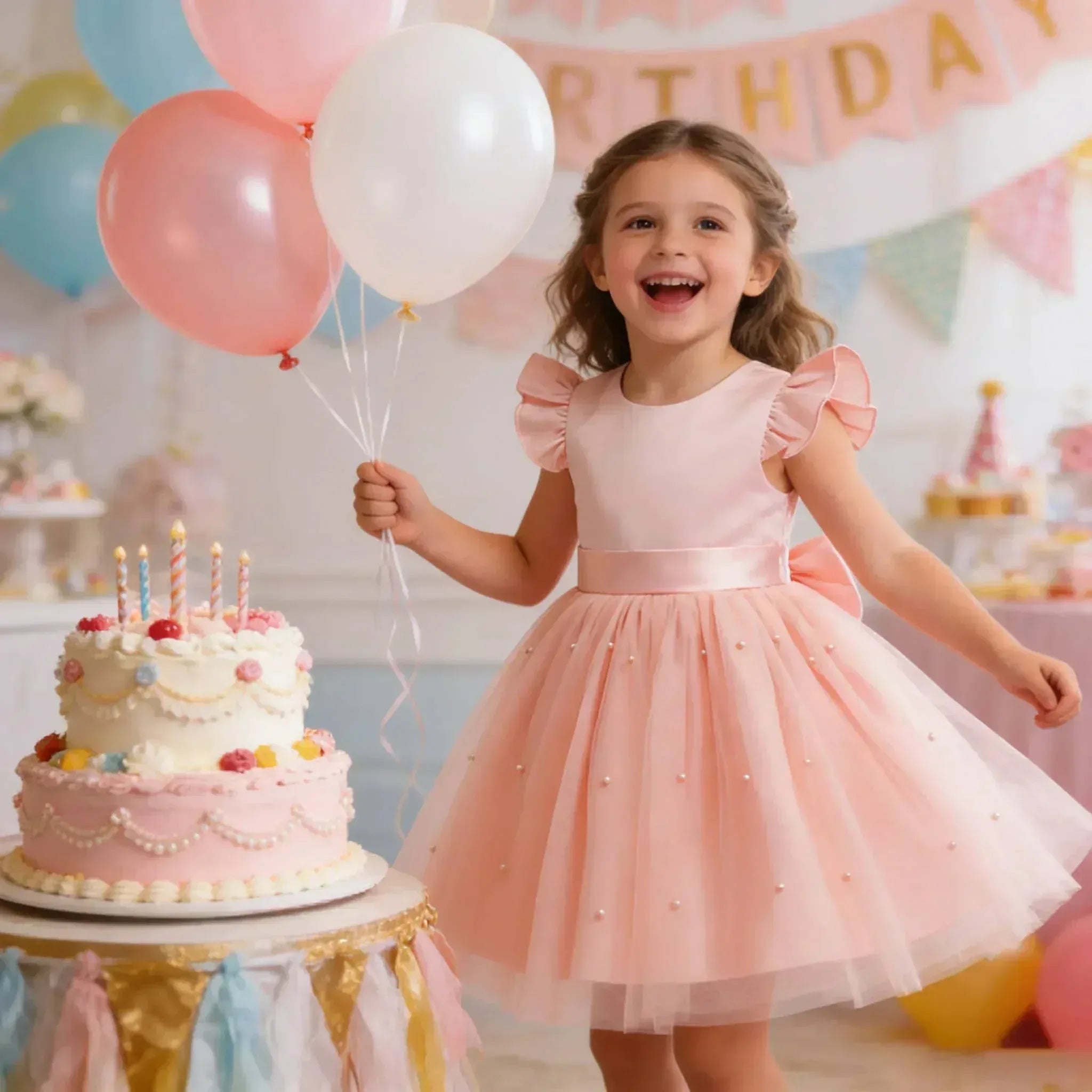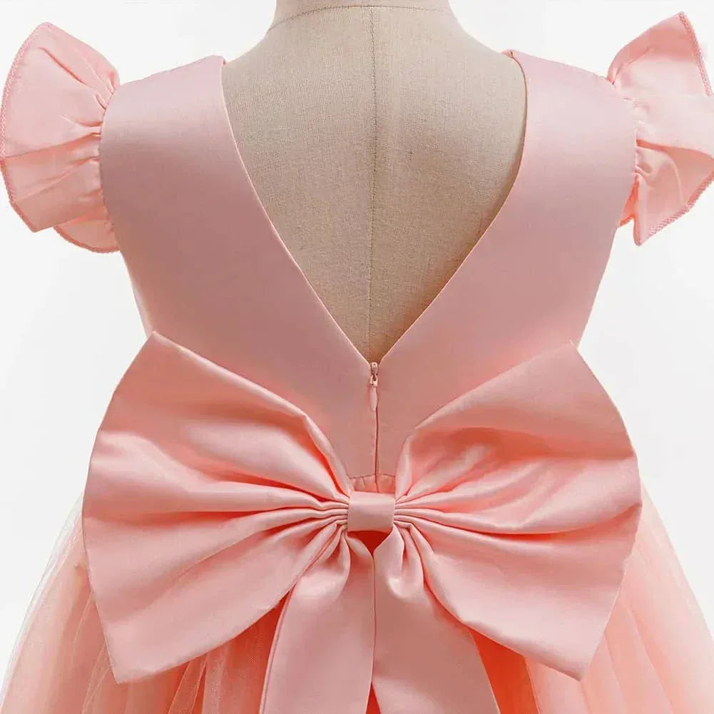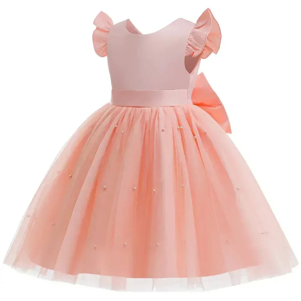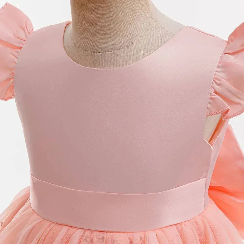 Flutter sleeves create a gentle, playful style. The fitted bodice provides comfort while the full skirt lets your child move freely. Satin ribbon at the waist ties into a bow, offering an adorable finishing touch. Wear this girls beaded party dress for birthdays, weddings, or other festive occasions.