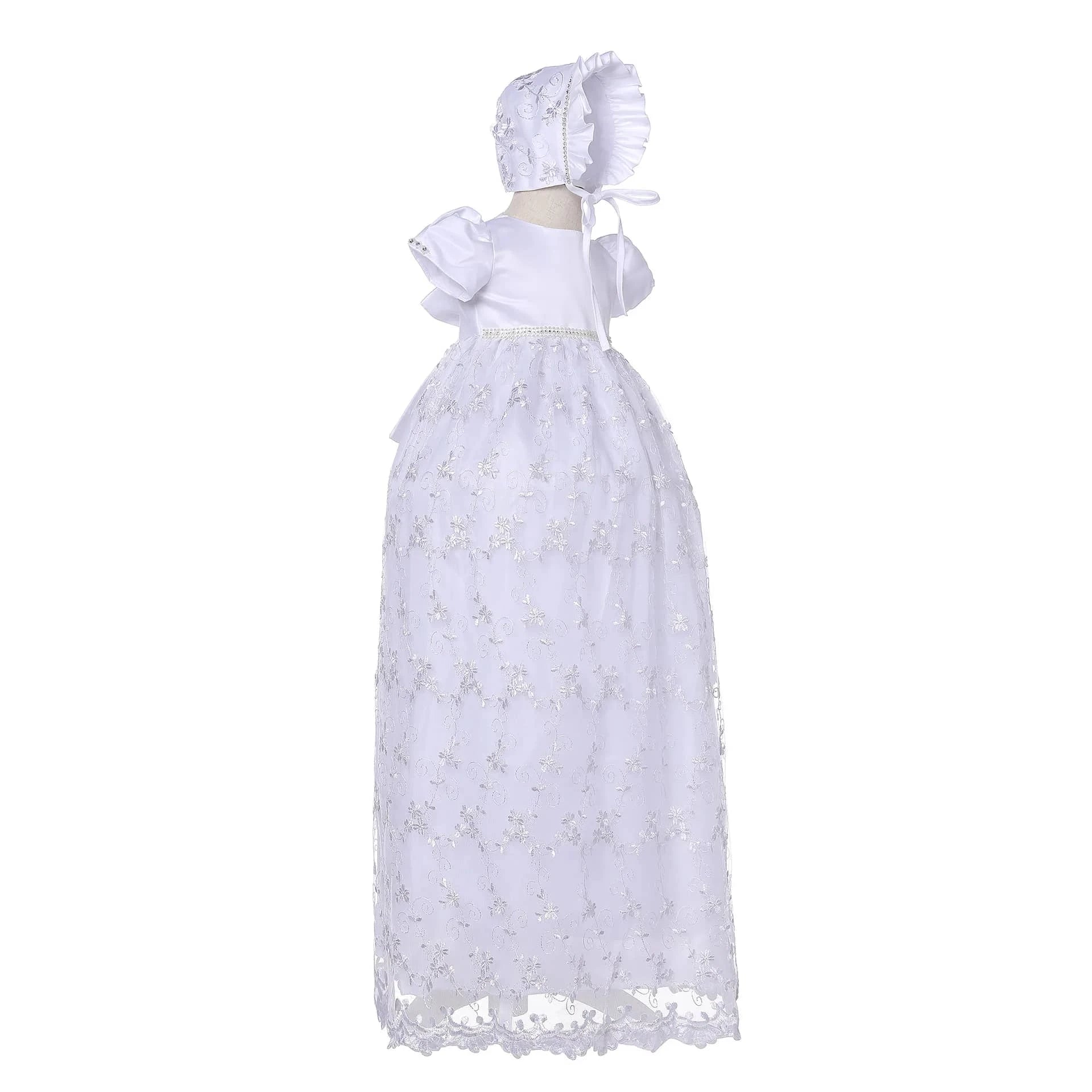 Soft, breathable fabric ensures your baby's comfort all day. The lined bodice provides easy movement. The long lace skirt has gentle floral patterns for a timeless effect. Puff sleeves and satin ribbon ties match perfectly with the bonnet.