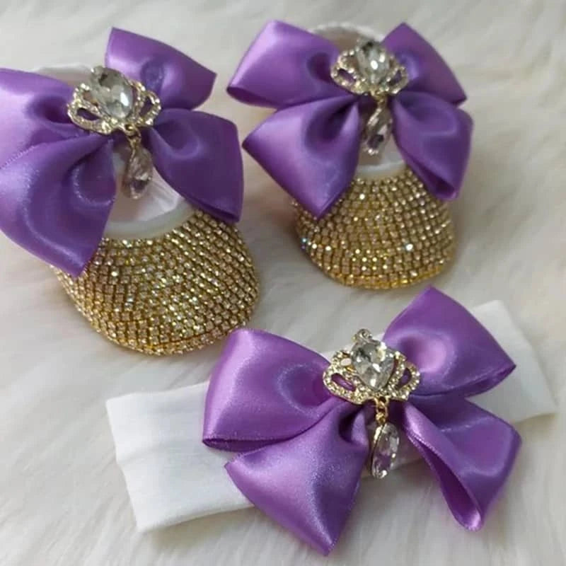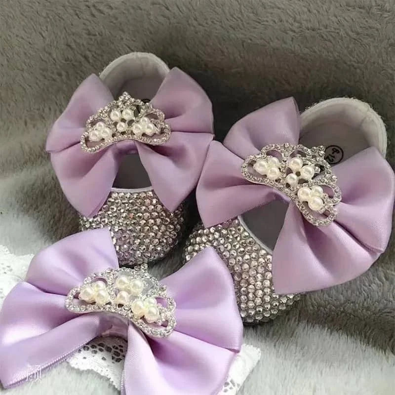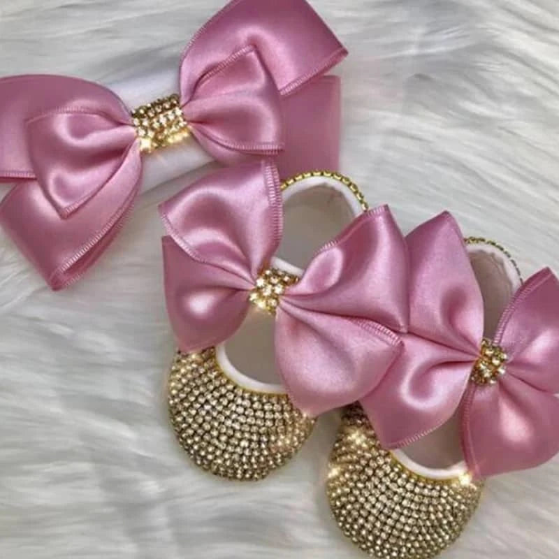 Each pair of rhinestone first walker shoes is lovingly crafted for comfort. The shimmering stones and smooth fabric prevent irritation. The non-slip bottom helps keep little ones steady as they explore. The matching headband completes the look for special photos and events.