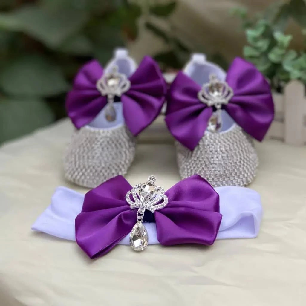 Delight new parents with the "Emilia" rhinestone first walker shoes. These charming baby shoes offer a soft sole that supports first steps. The secure fit gives tiny feet stability. Rhinestone embellishments sparkle with each movement. The bold purple bow adds a playful and stylish accent.