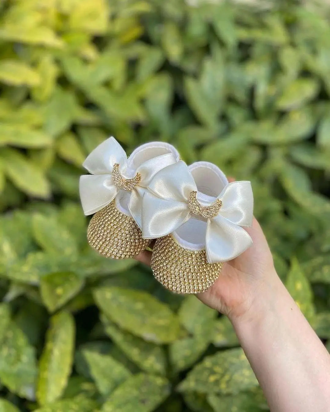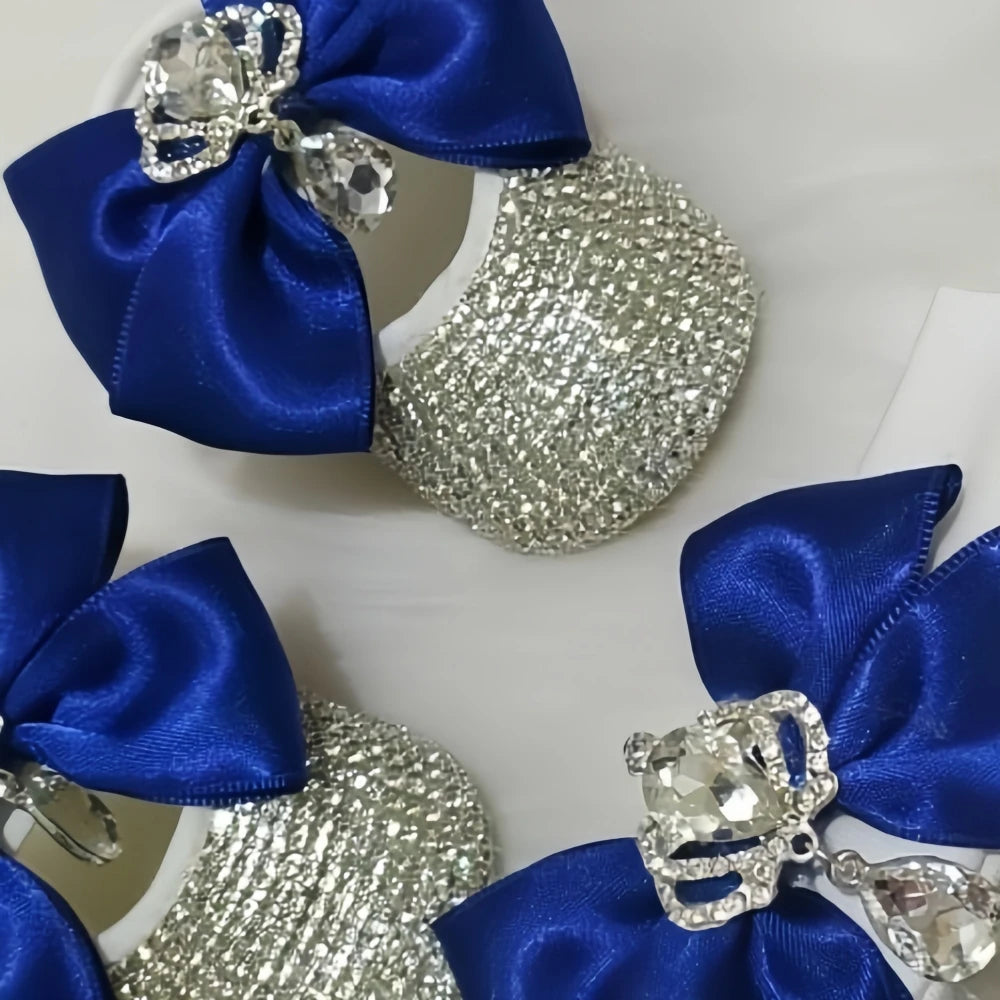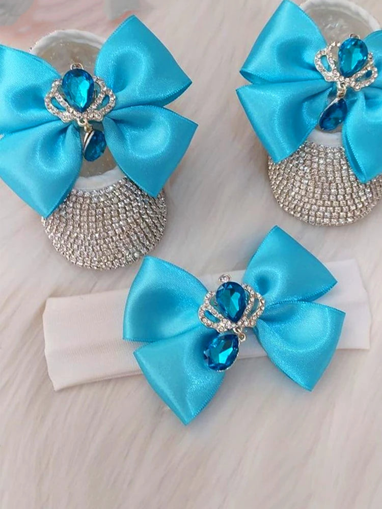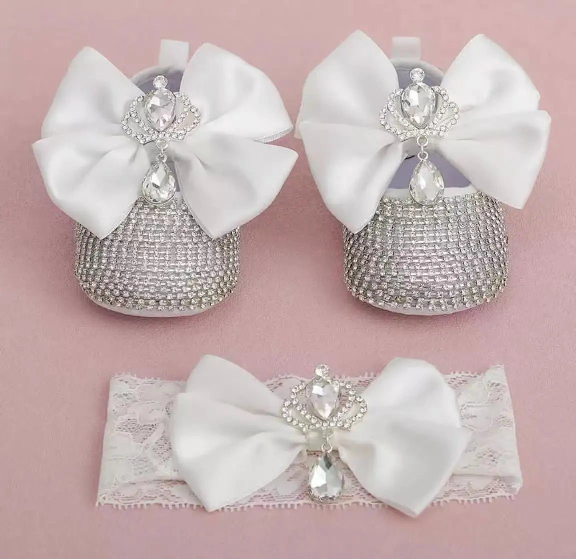 Introducing the "Marissa" set—an exquisite collection designed for your little one's most memorable moments. This curated ensemble features elegant Mary Jane shoes adorned with sparkling rhinestones and a coordinating headband, both customizable in crystal and ribbon colors. Crafted with premium materials, including delicate beads, lace, and ribbons, these keepsake pieces offer a true-to-size fit with soft cotton outer soles suitable for all seasons. Ideal for baptisms, weddings, christenings, celebrations, and professional portraits, the "Marissa" set combines luxury with comfort. Each piece is thoughtfully designed to treasure those precious early memories while keeping your baby's feet gentle and supported. Adult supervision is recommended due to small decorative elements.