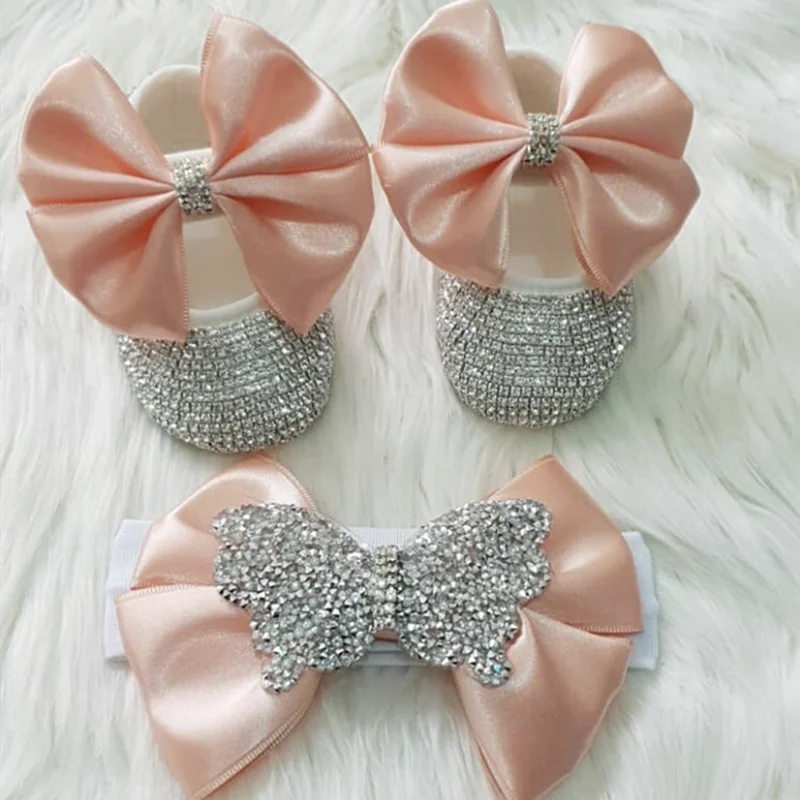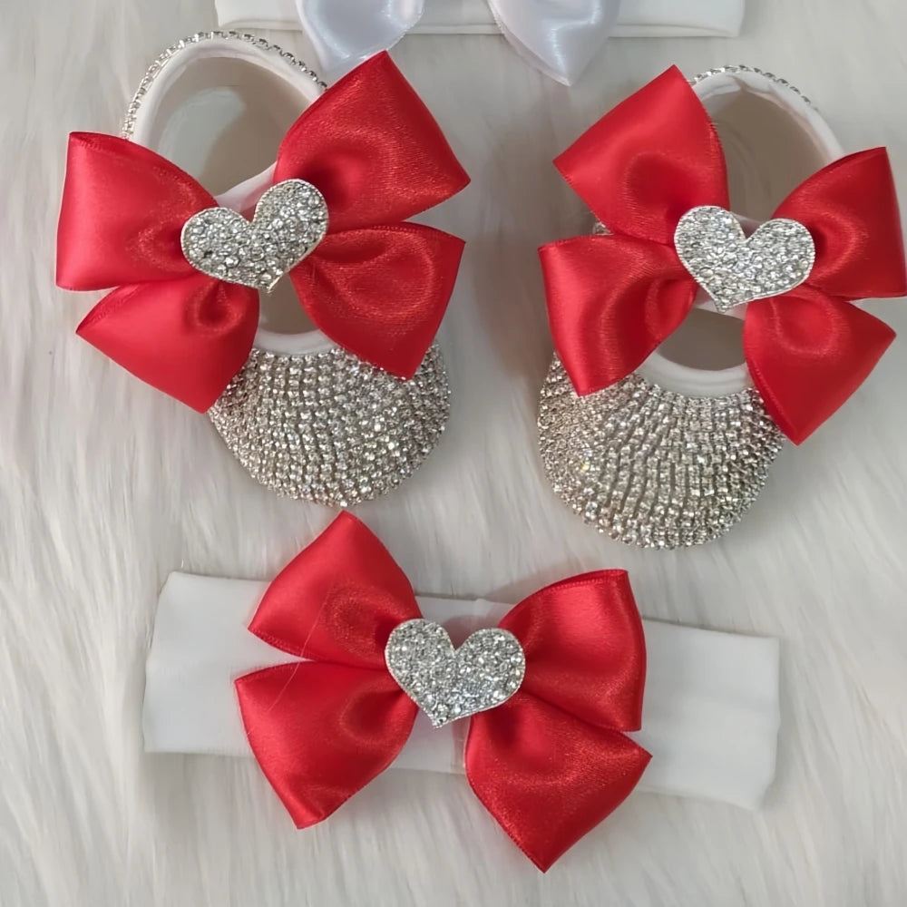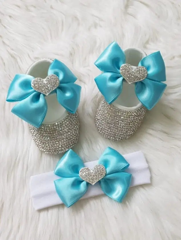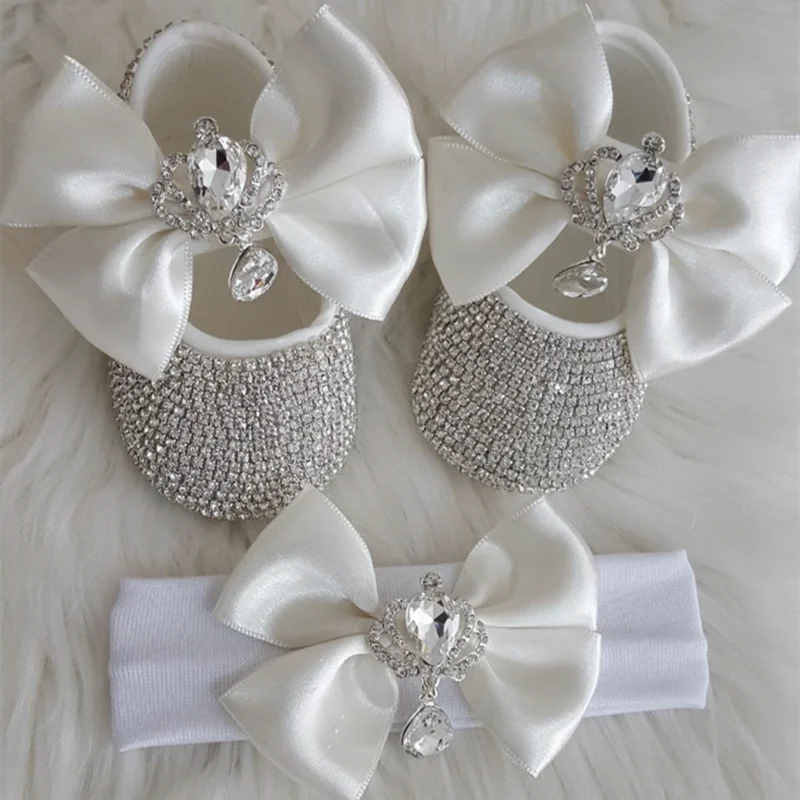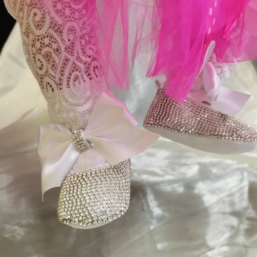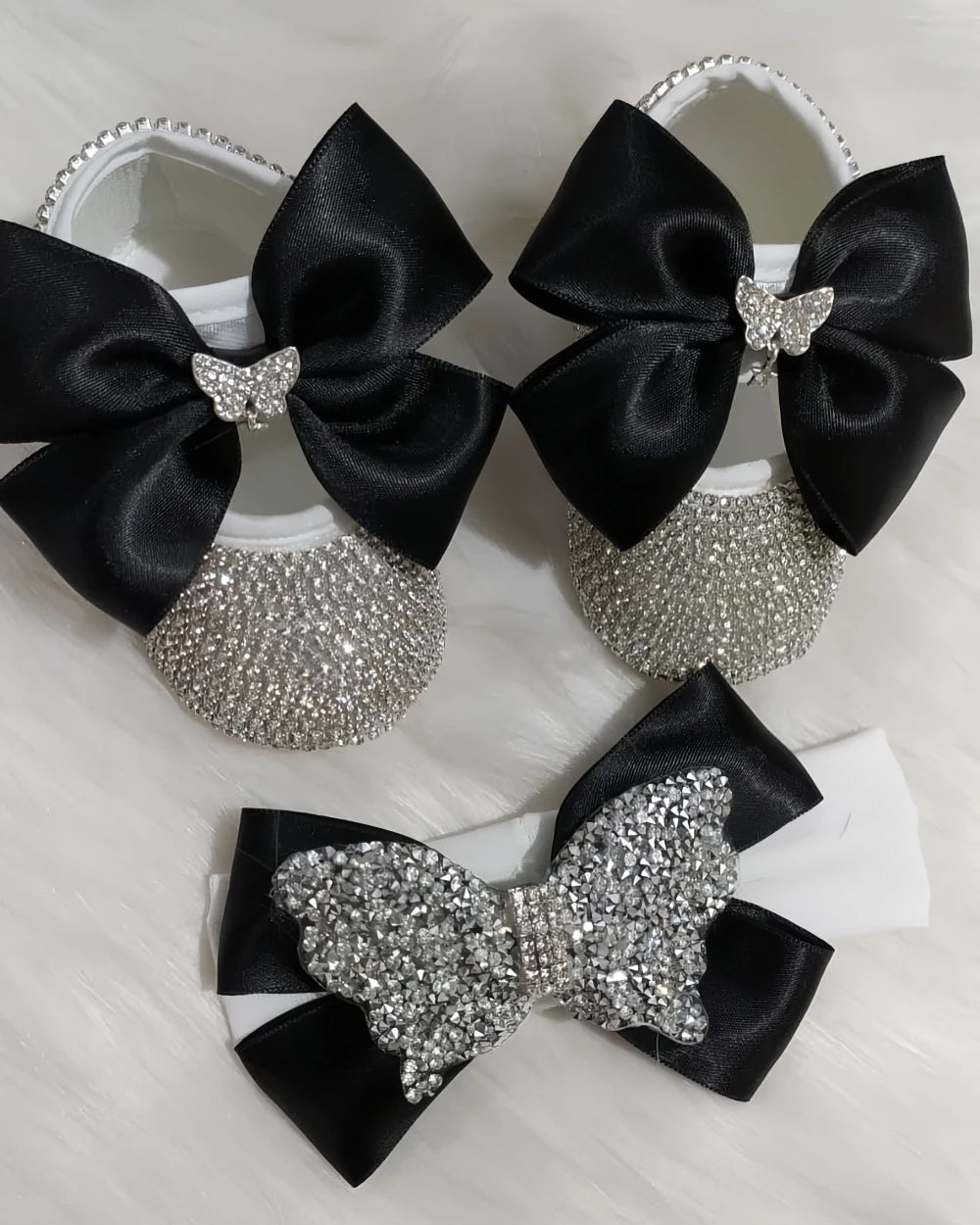 Introducing the "Marissa" set—an exquisite collection designed for your little one's most memorable moments. This curated ensemble features elegant Mary Jane shoes adorned with sparkling rhinestones and a coordinating headband, both customizable in crystal and ribbon colors. Crafted with premium materials, including delicate beads, lace, and ribbons, these keepsake pieces offer a true-to-size fit with soft cotton outer soles suitable for all seasons. Ideal for baptisms, weddings, christenings, celebrations, and professional portraits, the "Marissa" set combines luxury with comfort. Each piece is thoughtfully designed to treasure those precious early memories while keeping your baby's feet gentle and supported. Adult supervision is recommended due to small decorative elements.
