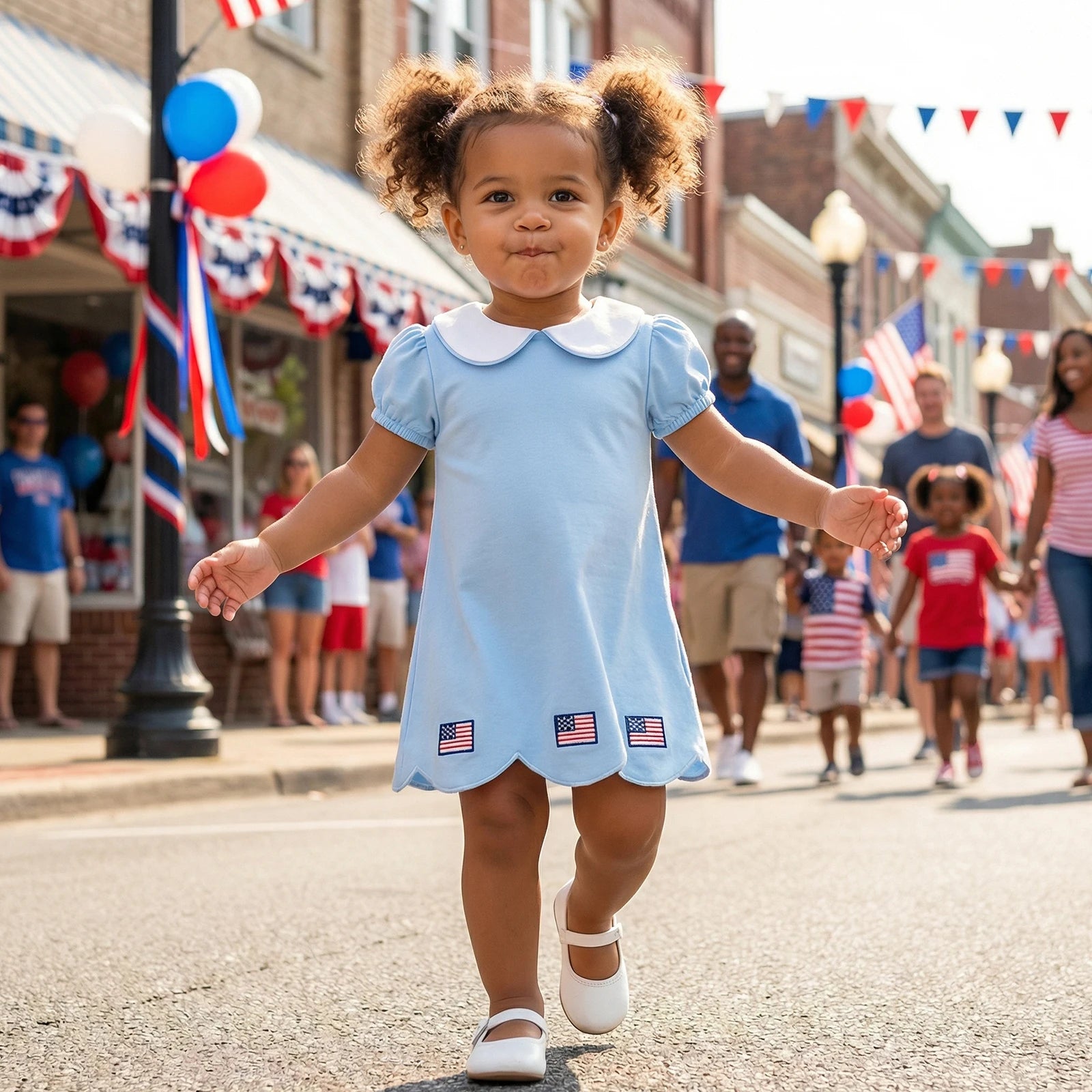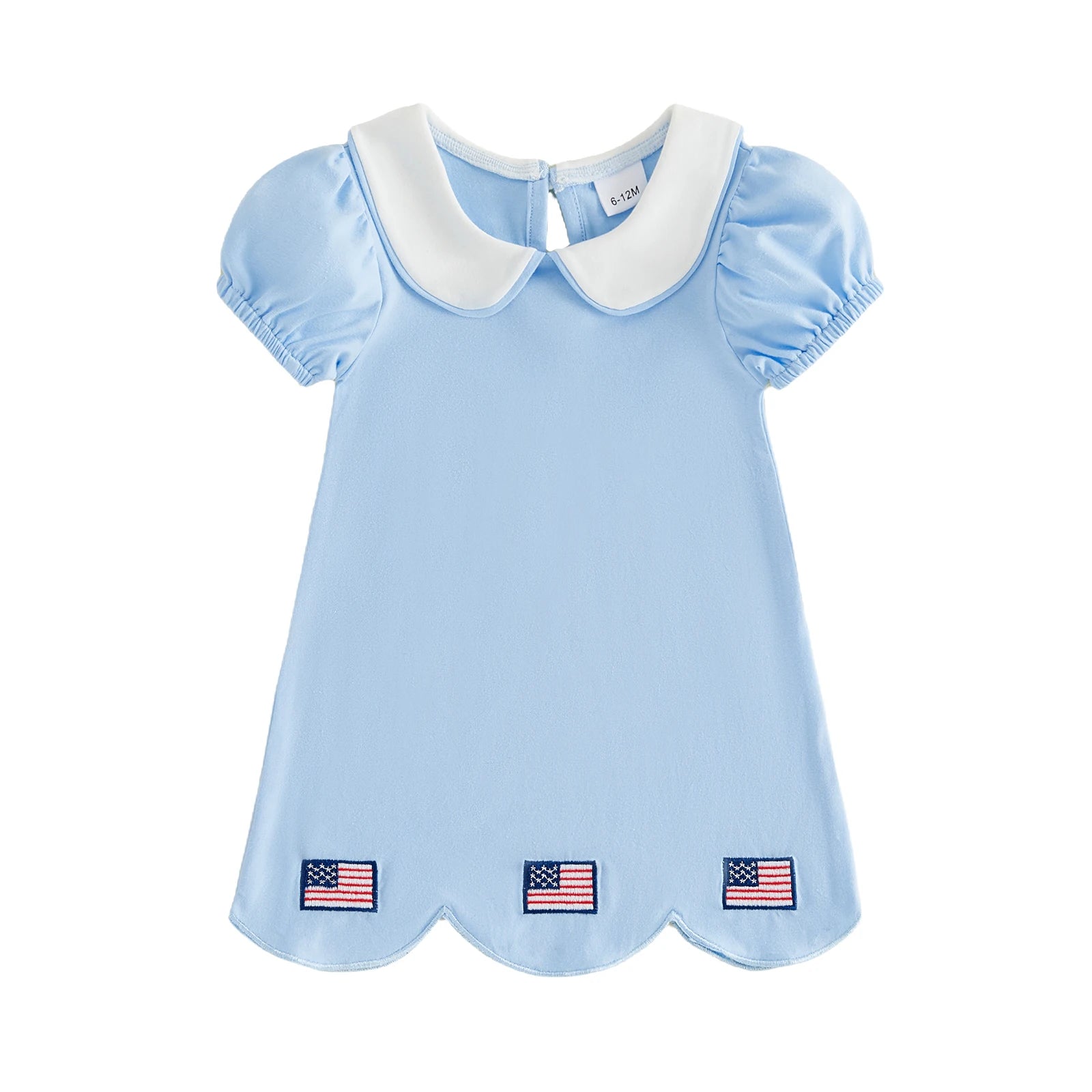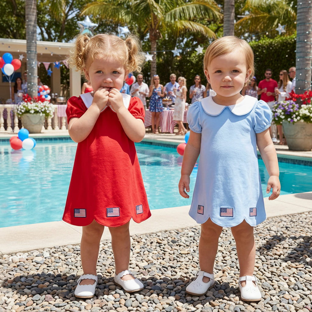 Celebrate classic coastal style and patriotism with our exclusive Patriotic Girl A-Line Dress. This charming piece combines a coastal timeless design with playful elements, perfect for any occasionâfrom July 4th festivities to casual family gatherings. With its embroidered flags and Palm Beach-inspired classic flair, this dress will make your little girl feel like a true star.