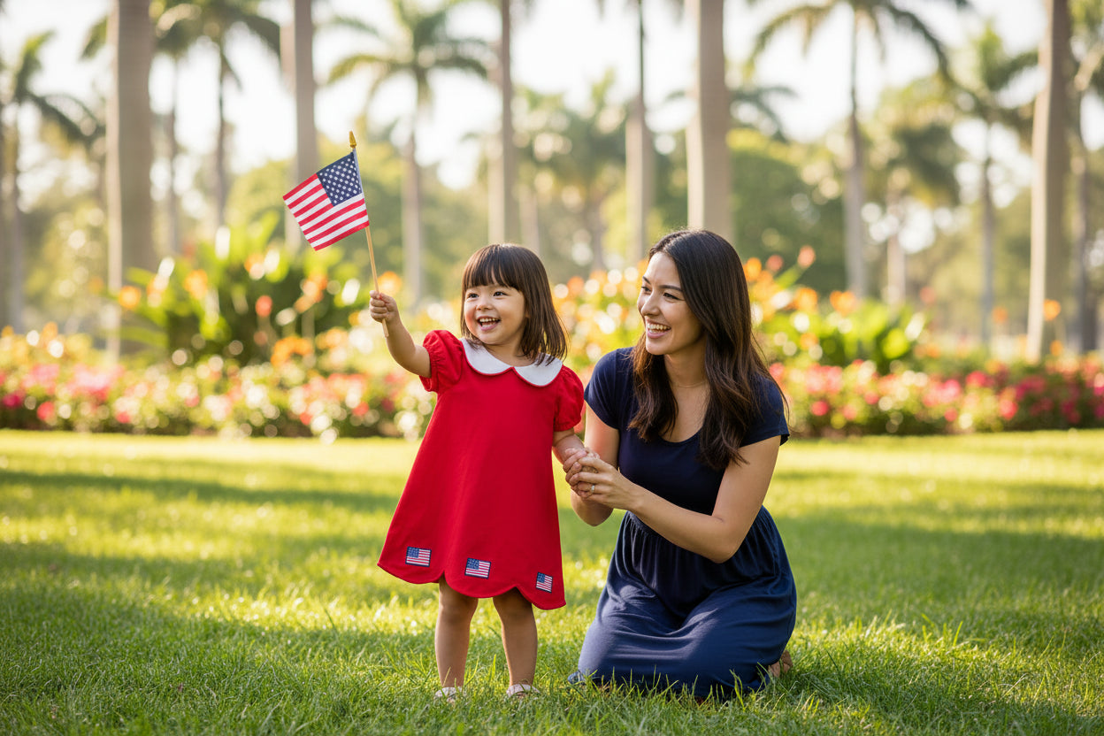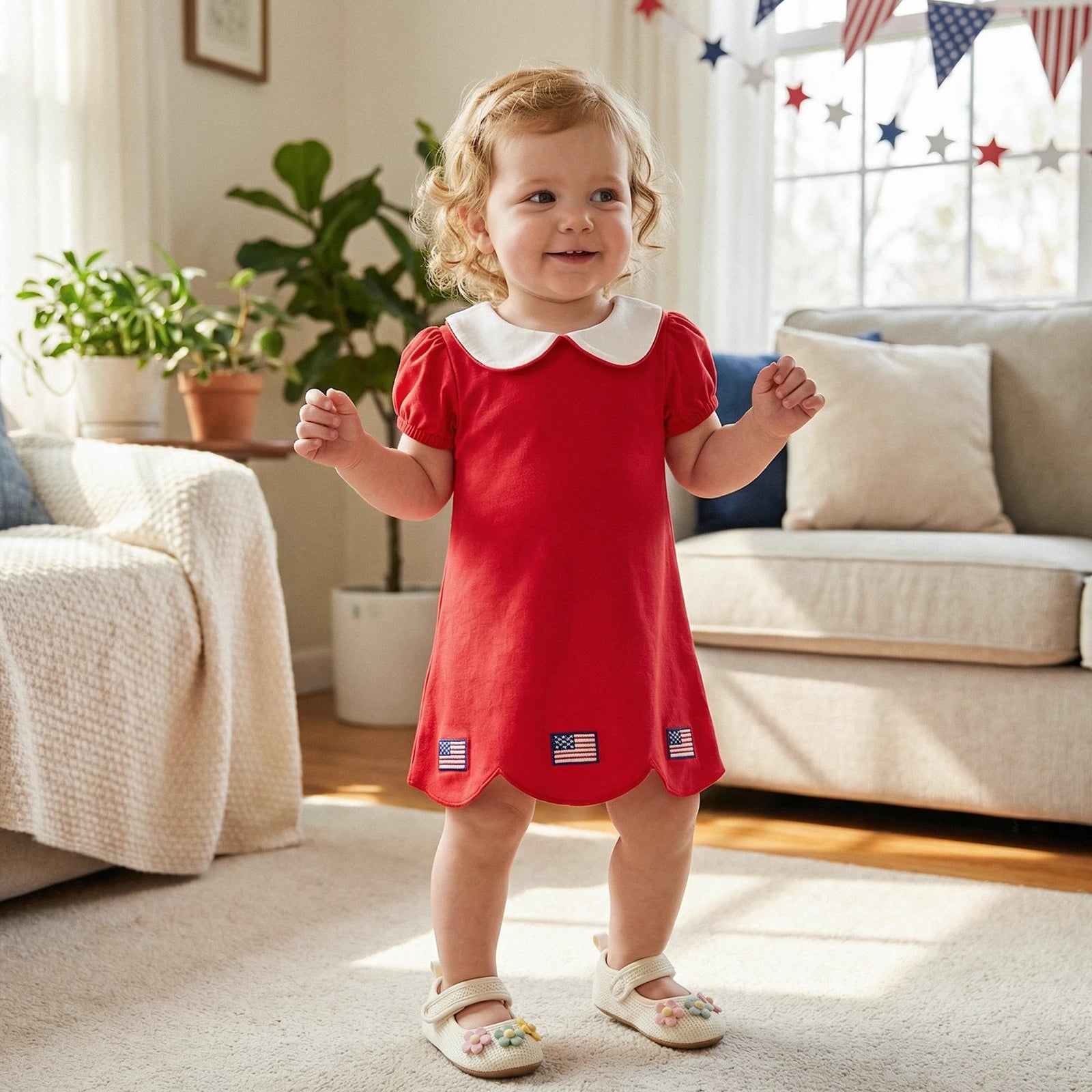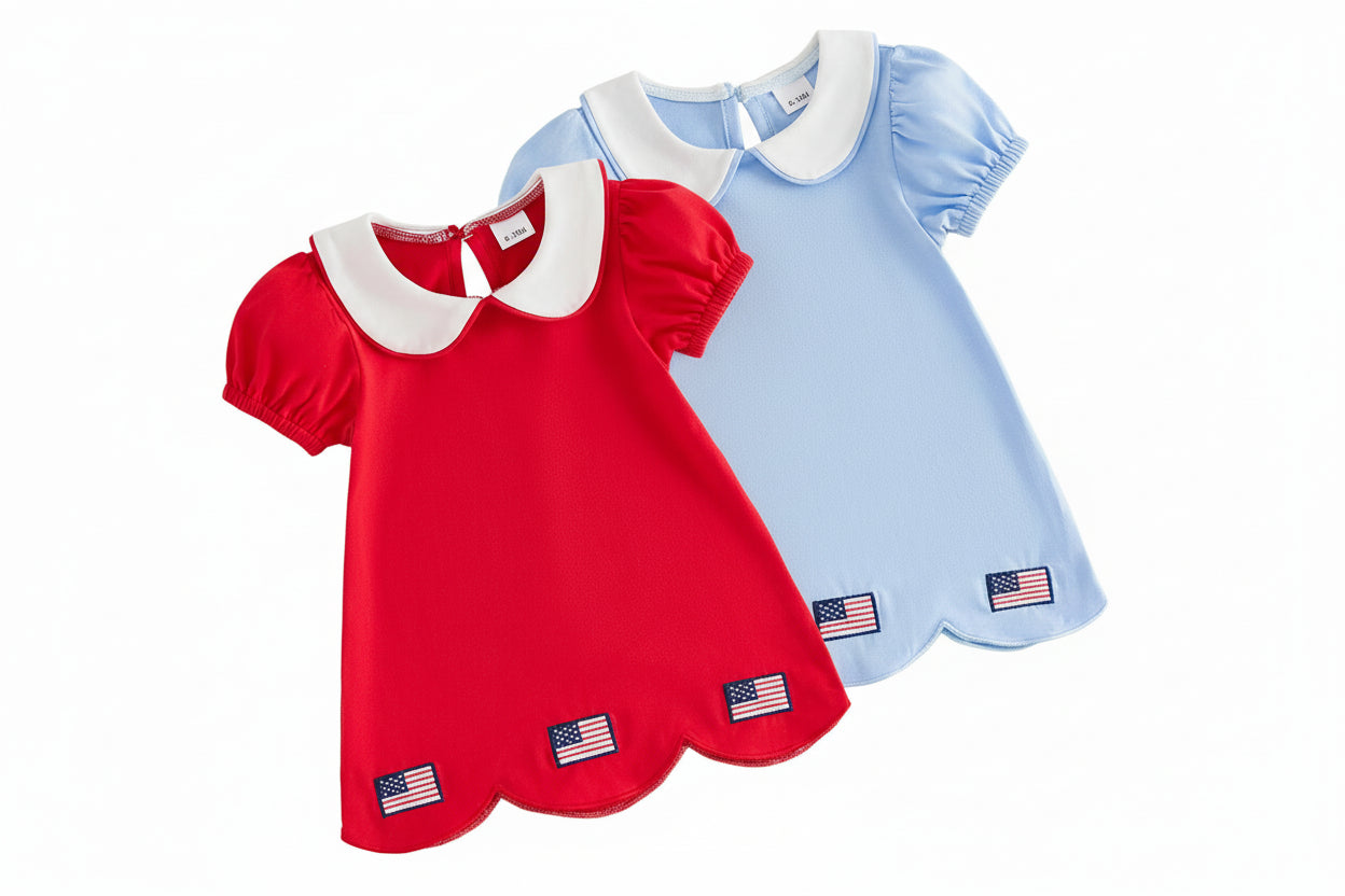 Celebrate classic coastal style and patriotism with our exclusive Patriotic Girl A-Line Dress. This charming piece combines a coastal timeless design with playful elements, perfect for any occasionâfrom July 4th festivities to casual family gatherings. With its embroidered flags and Palm Beach-inspired classic flair, this dress will make your little girl feel like a true star.