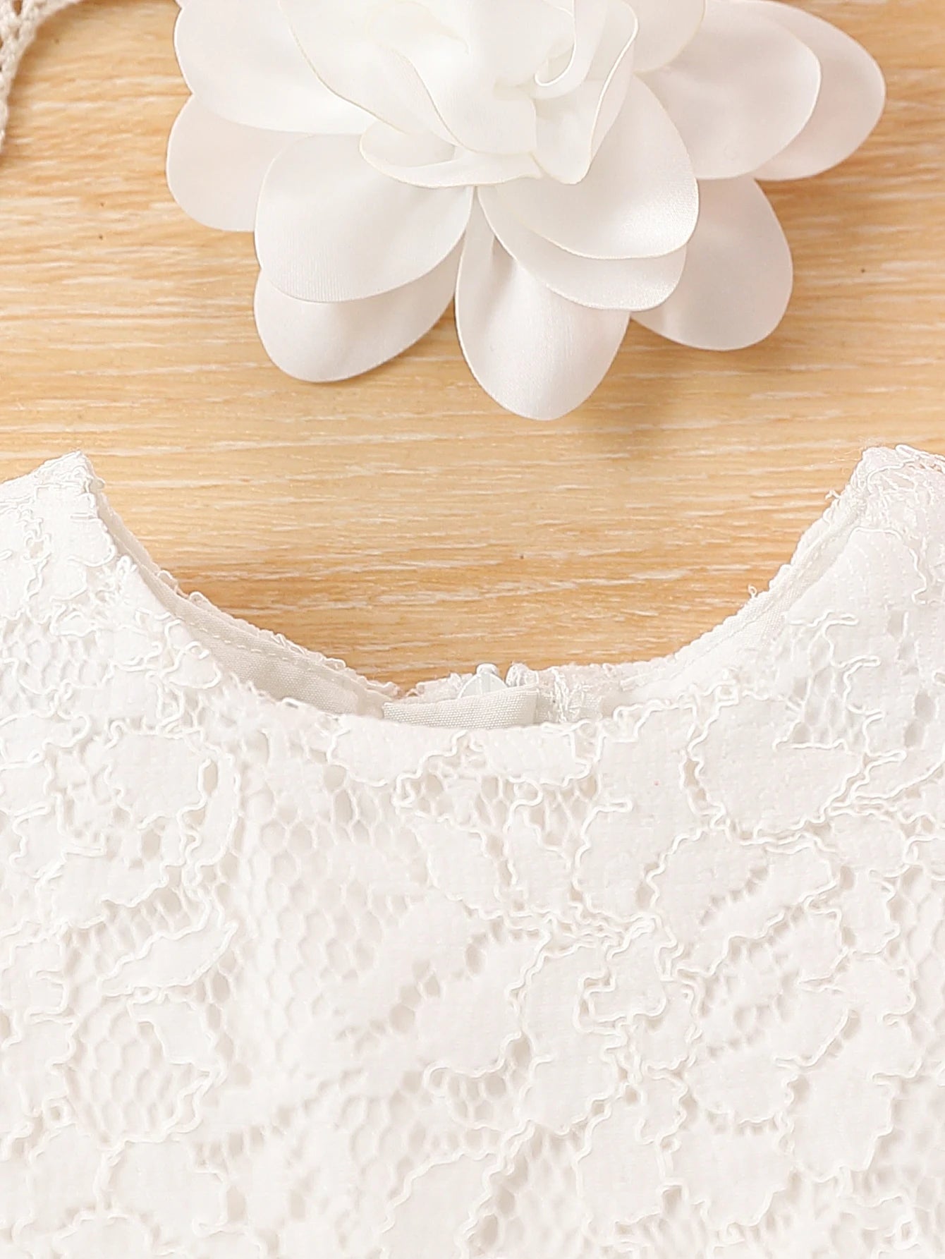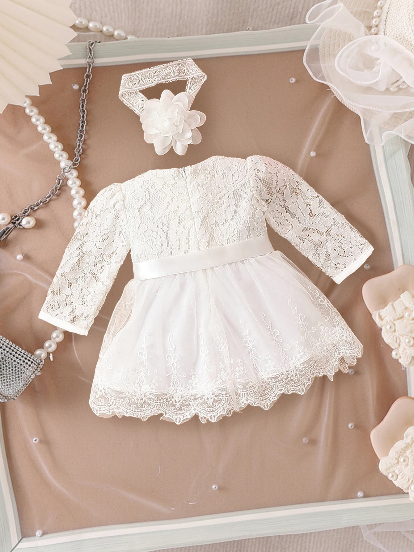 Our exquisite two-piece ensemble features delicate white lace craftsmanship with a refined front bow and gracefully sashed waist. The coordinating lace headband completes the sophisticated look, making it an ideal choice for your little one's special occasions—from weddings and christenings to family portraits and formal celebrations.