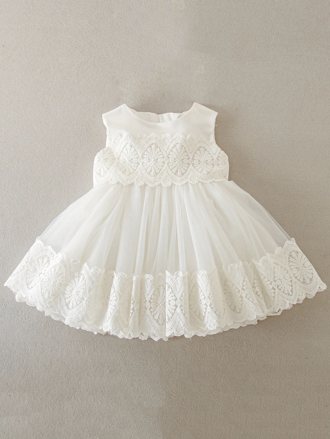 The sleeveless silhouette showcases a luxurious tulle skirt with lace accents, creating movement and dimension perfect for special moments. A classic crew neckline and secure zippered back closure ensure both comfort and ease when dressing.