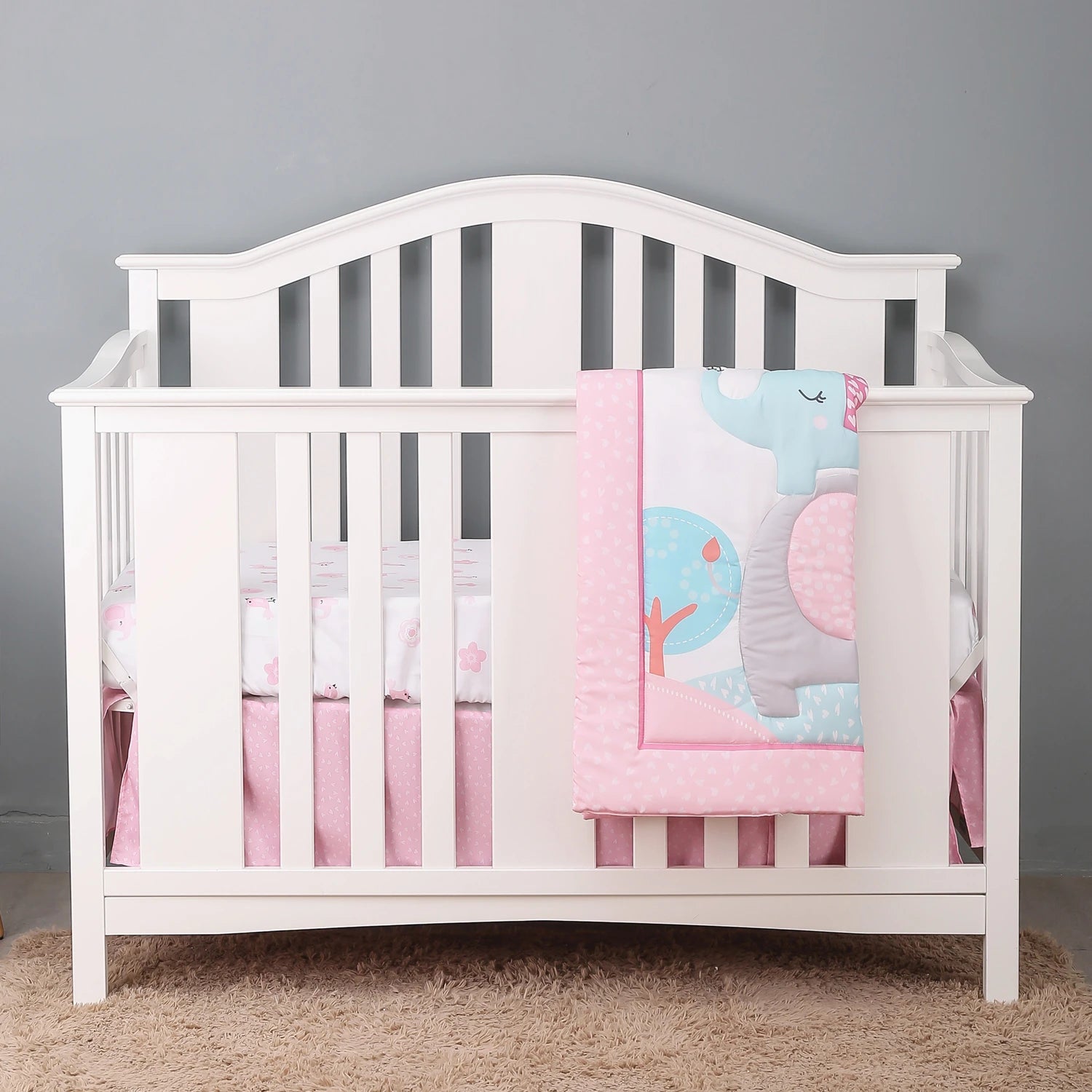 Transform your nursery into a welcoming sanctuary with this thoughtfully curated 4-piece crib bedding set. Each ensemble features charming, baby-inspired prints available in four distinctive color options, ensuring you'll find the perfect match for your décor vision. The collection includes a plush comforter that provides gentle warmth, a fitted sheet engineered for secure, slip-free placement, a coordinating blanket for layered comfort, and a tailored crib bed skirt that adds a polished finishing touch to the nursery aesthetic.