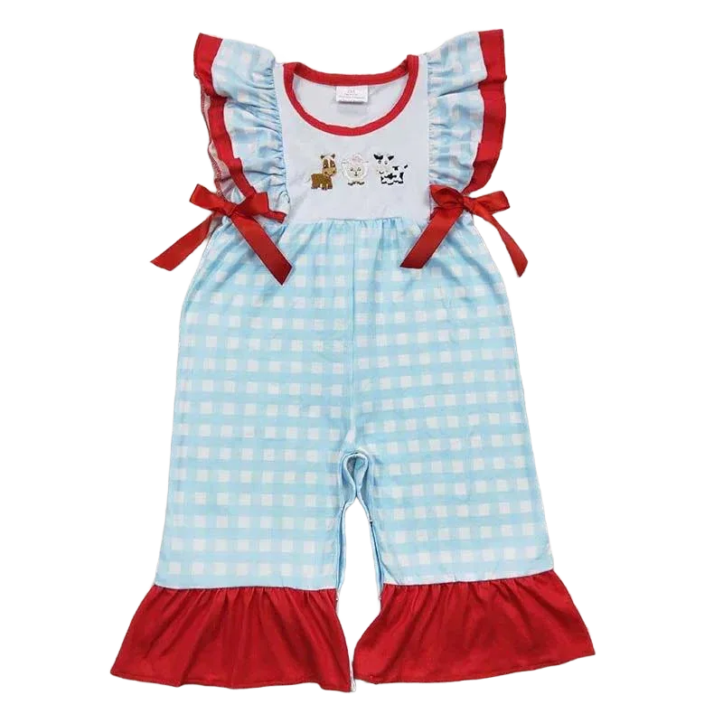 The baby farm romper with ruffles features sweet bold ruffles on the straps and hems. Gingham checks in pale blue and white capture classic country style. Two embroidered farm friends sit on the chest. Bright red edging and bows add pops of color. Every detail is made for comfort and cuteness.