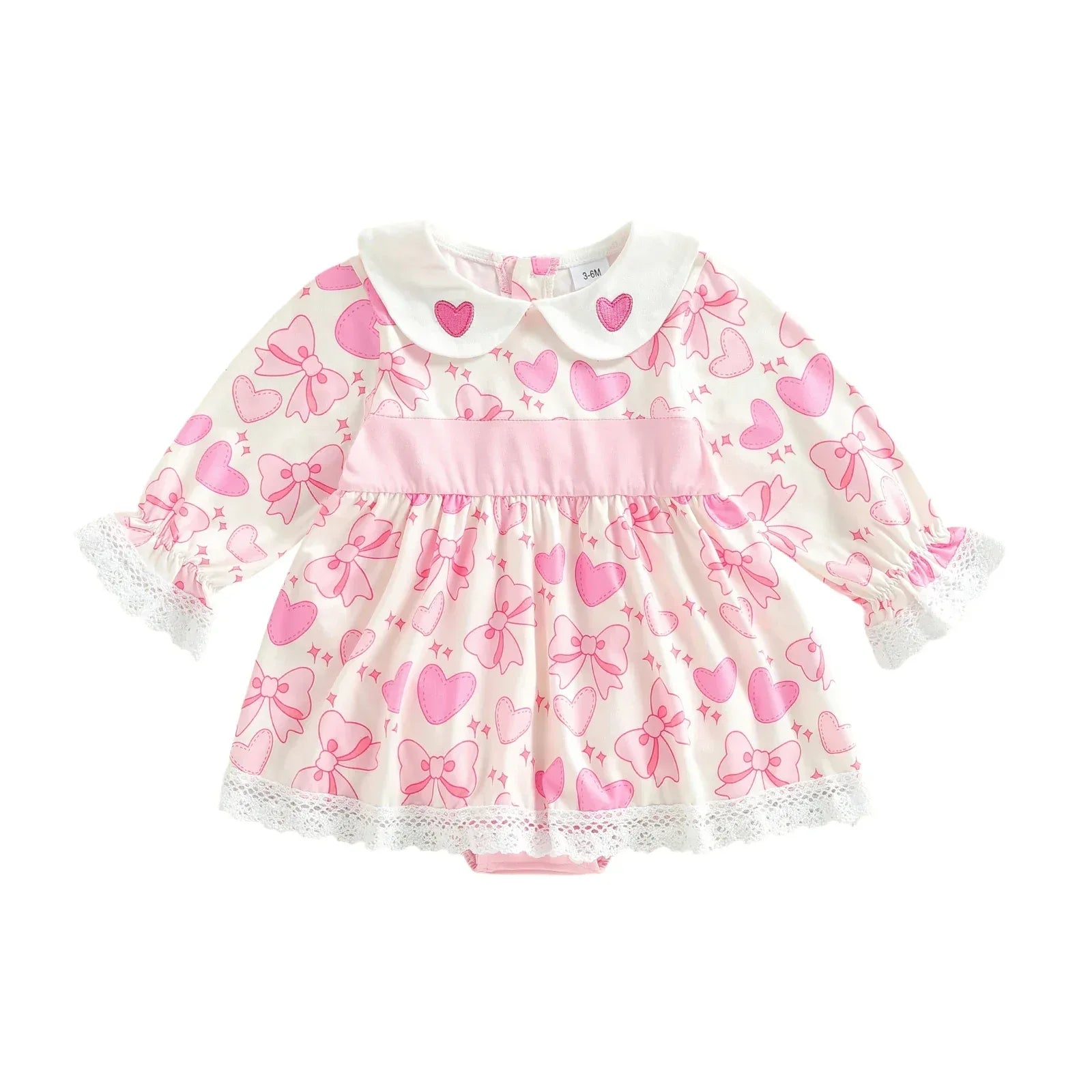 The Little Hearts Babies Print Party Dress in Palm Way Pink is a charming choice for your little one. It features a sweet pink heart and bow pattern. The classic white Peter Pan collar and soft lace trim add a gentle touch. This baby girl heart print dress from The Palm Beach Baby is ideal for both casual outings and special events.