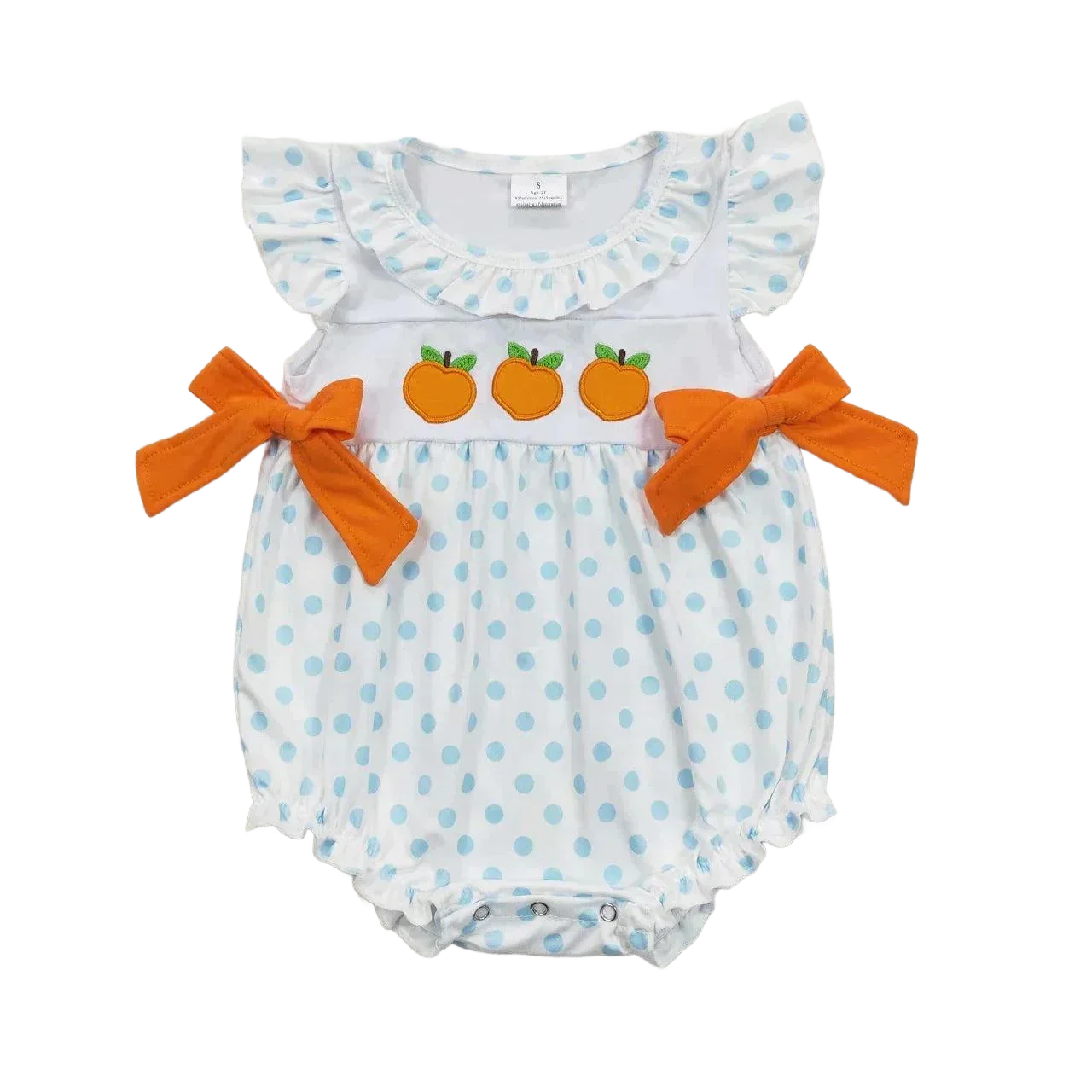 Discover summer style with the 'Orange Sweetie' Baby Summer Romper from The Palm Beach Baby. This orange baby romper for girls is a charming choice for the warmer months. It features playful blue polka dots, bright orange bows, and sweet embroidered orange fruit across the chest. The Peter Pan collar adds a timeless touch to the outfit.