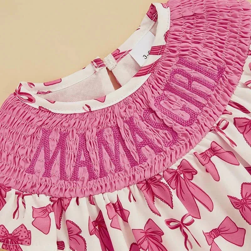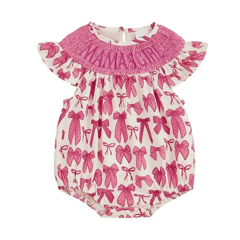 Introducing the "Mama's Girl" Baby Smocked Bubble, a delightful romper designed specifically for baby girls and toddlers who adore vibrant fashion. This charming outfit features flutter sleeves and is perfect for any occasion, from playdates to family events. Your little one will shine in either a lively, multi-colored floral design or an adorable hot pink bow option. Both styles boast an embroidered smocked bodice, encapsulating cuteness in every stitch.