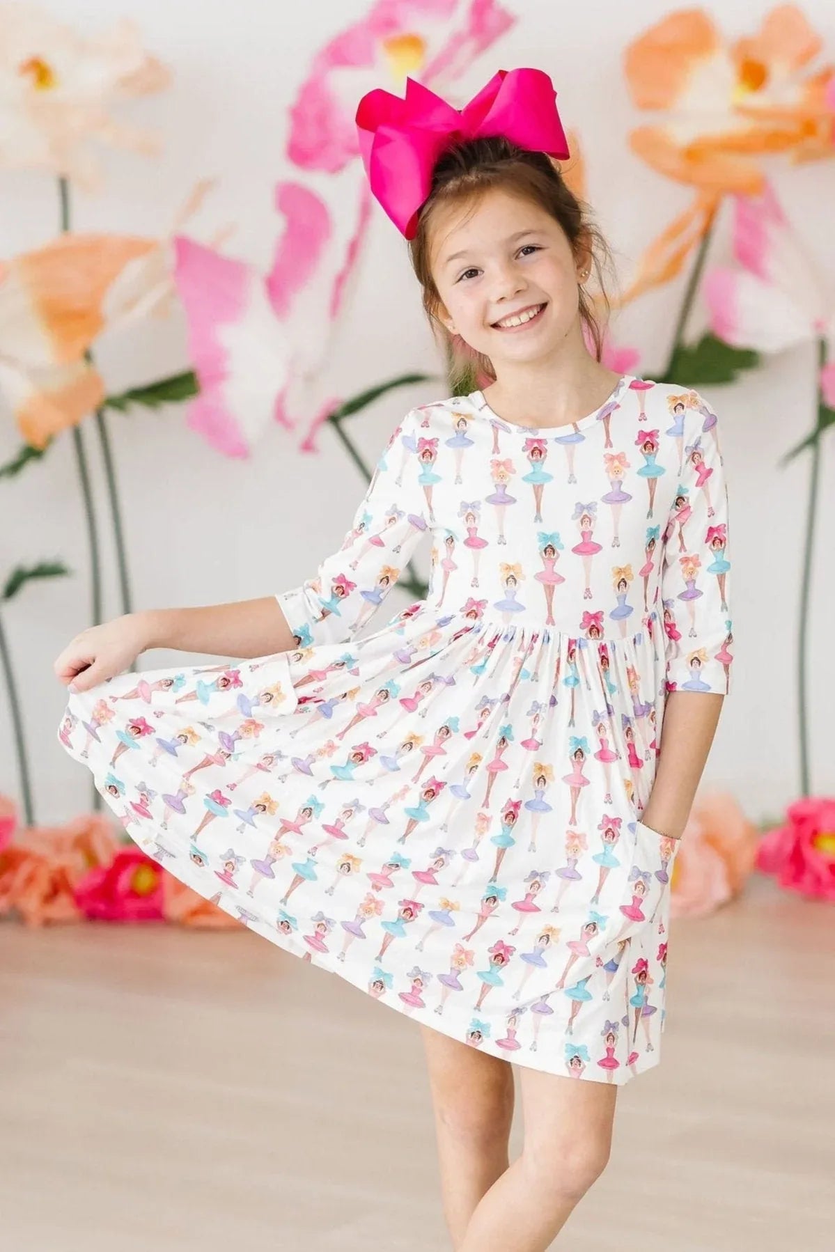 Ballerina Bows 3/4 Sleeve Pocket Twirl Dress for Girls