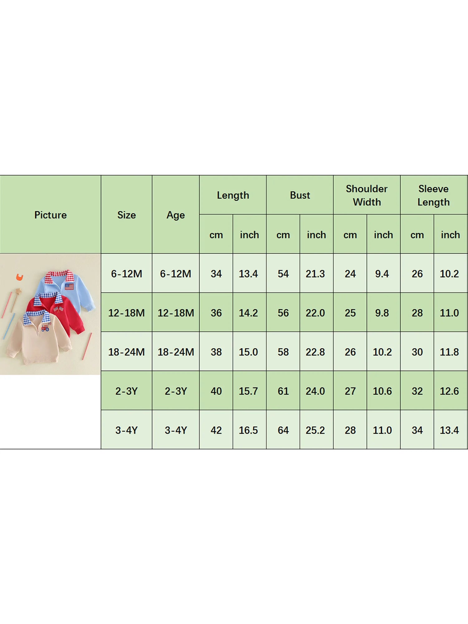 6-12M Length: 13.39 Bust: 21.26 Shoulder: 9.45 Sleeve: 10.24 Advised Age: 6-12 Months