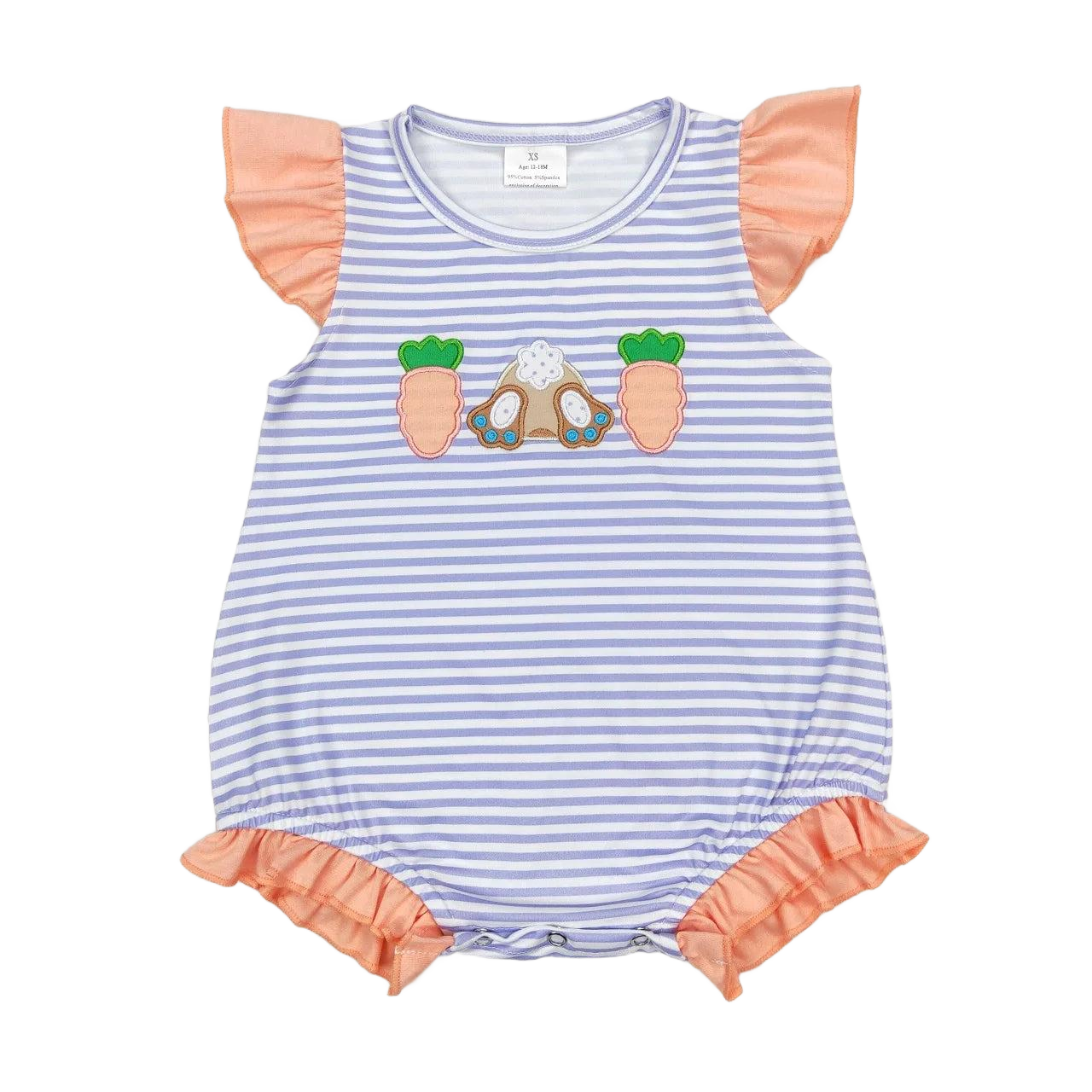 Showcasing pastel blue stripes and adorable carrot accents, this romper celebrates cheerful, playful style. The bunny baby romper is finished with frilly orange details at the sleeves and legs. These cute touches capture a whimsical look perfect for spring and summer adventures.