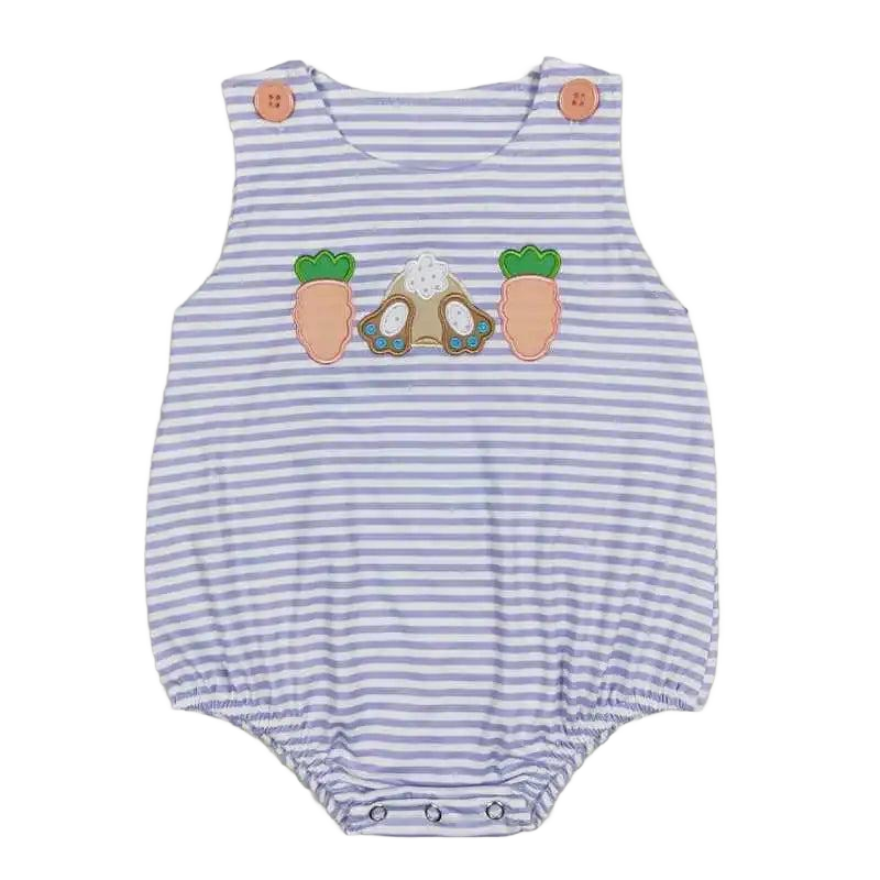 The "Bunny Cutie" themed baby's romper from The Palm Beach Baby is an irresistible choice for your little one. This bunny romper brings together charming design and soft comfort. It features a gentle lavender and white striped pattern with playful bunny and carrot appliqués across the front.