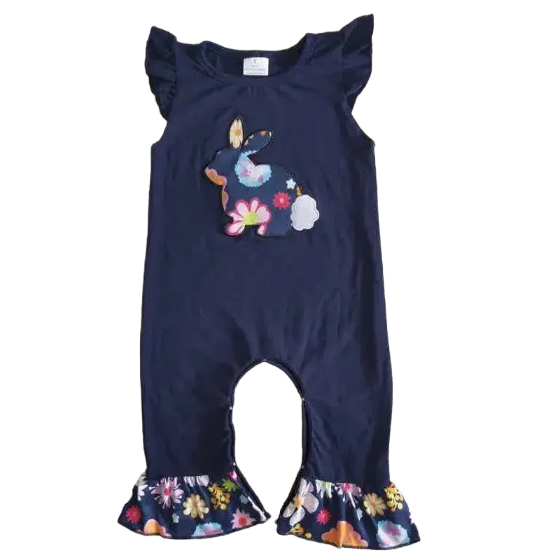 Change out her wardrobe in this retro "Bunny Flower Power" bunny boho romper, a delightful addition to your little one’s wardrobe! This charming romper is designed for newborns to toddlers and features a stunning floral accent that adds a touch of whimsy to any outfit. Made in a beautiful solid navy blue, it's both stylish and versatile, making it perfect for all four seasons.