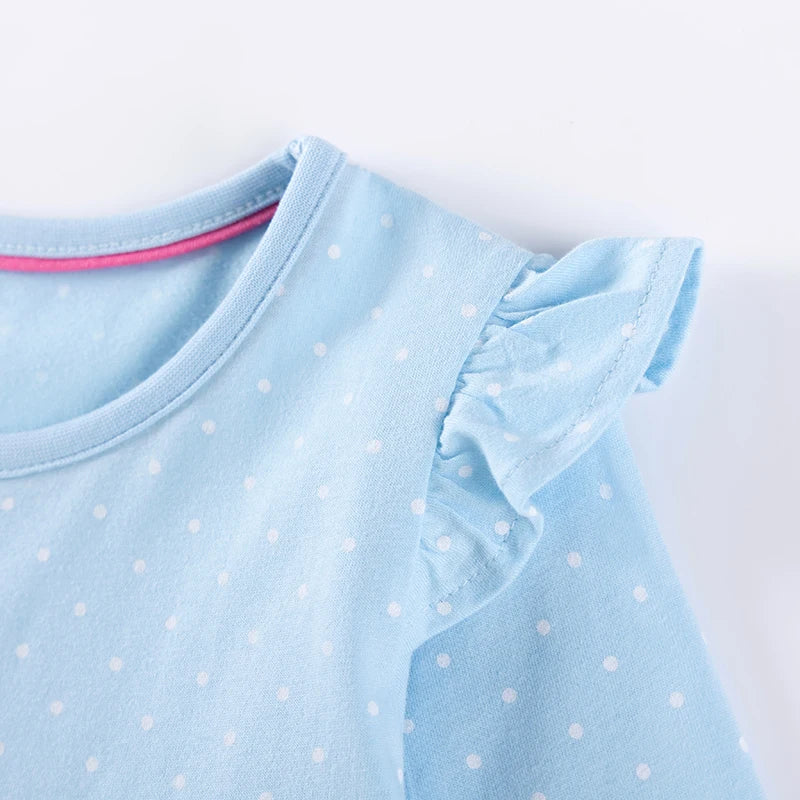 The flutter sleeves provide a playful touch, perfectly suited for spirited play. The classic rounded neckline adds a dash of sweetness, making sure she looks adorable for any occasion.