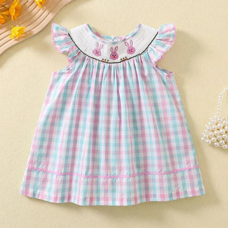 Featuring an enchanting plaid pattern in charming pinks and blues, the "Bunny Mine" Plaid Party Dress stands out with its sweet embroidered bunnies. The playful butterfly sleeves add an extra touch of whimsy, making it perfect for any little girl who loves to express herself through fashion.
