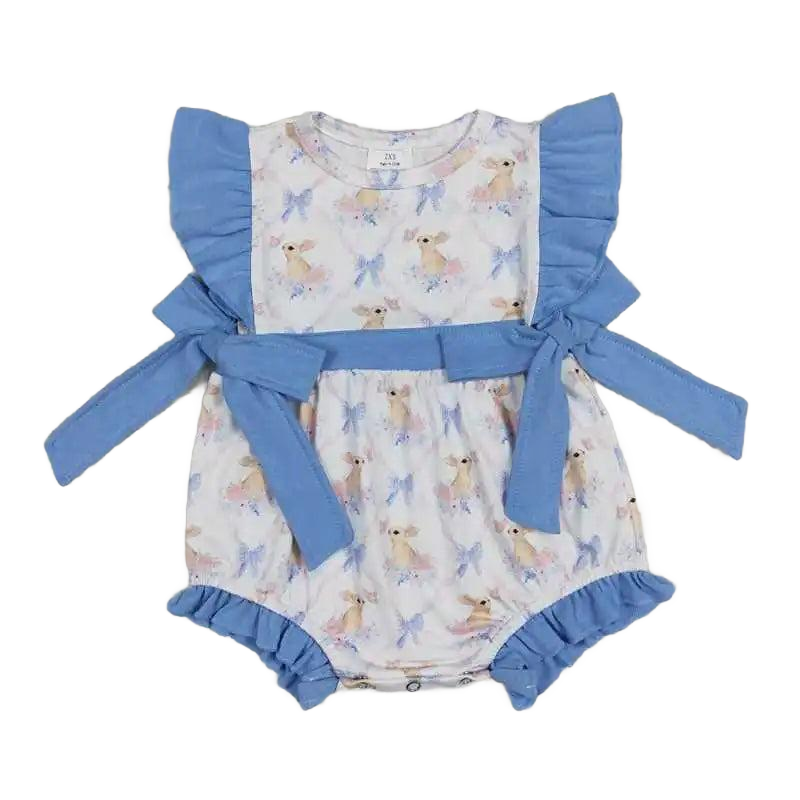 The romper features ruffled sleeves that make the outfit stand out. A bow at the waist brings added cuteness. Snap closures at the bottom make diaper changes quick. The lightweight fabric keeps your baby cool and comfortable, perfect for busy days or peaceful naps.