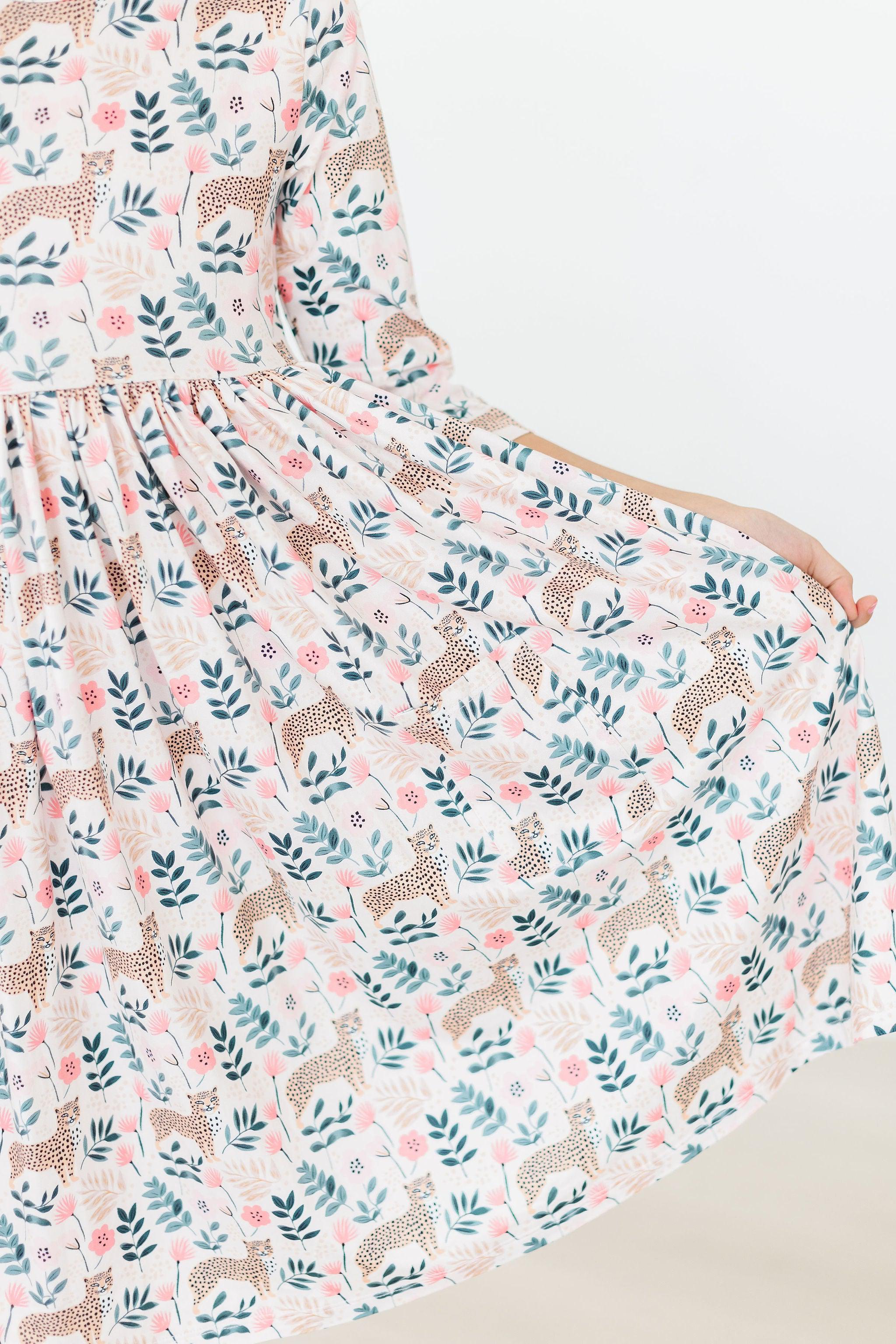 Take on the world with the Cheetah Girl 3/4 Sleeve Pocket Twirl Dress! Perfect for school, special occasions, and everyday play. This dress is designed by parents - twirly, comfortable, and easy to wash for mom, and easy to put on for dad's chubby, big-headed toddler. Quick on and off with a scoop back and modest neckline. Pair with Twirl for unstoppable adventures!